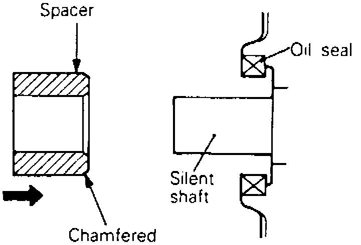 3. Apply thin coat of engine oil to outer inside diameter of space and install with chamfered end facing oil seal, Fig. 40.