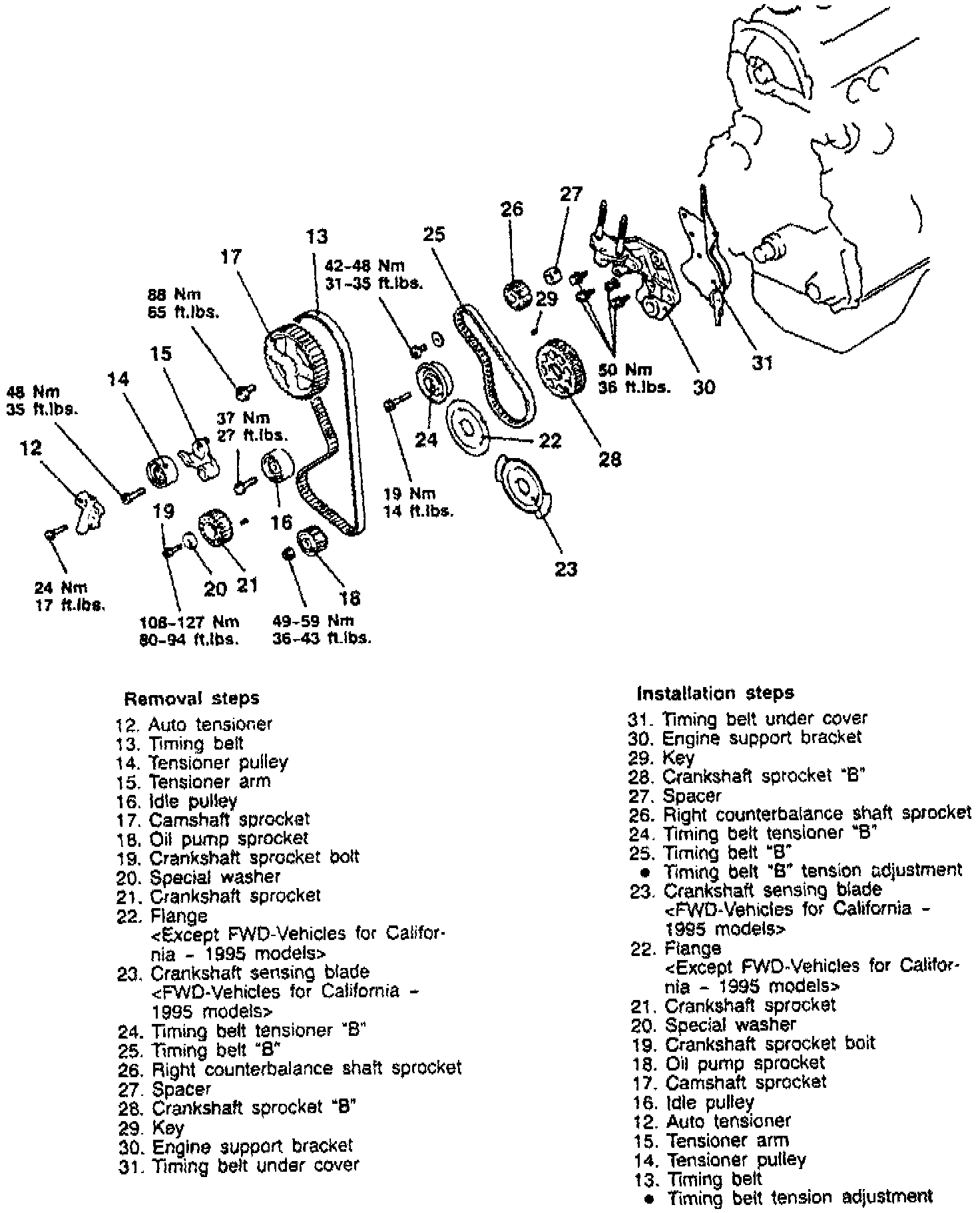 5. Remove right balance shaft sprocket and spacer, crankshaft sprocket and key, then engine support bracket and timing belt under cover.