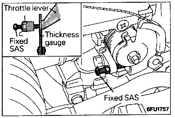 3 Insert a feeler gauge with a thickness of 0.65 mm (0.0256 in.) between the fixed SAS and the throttle lever.