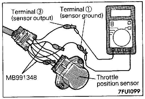 b. Connect a digital voltmeter between the throttle position sensor terminal 03 (sensor output) and terminal 01 (sensor ground).