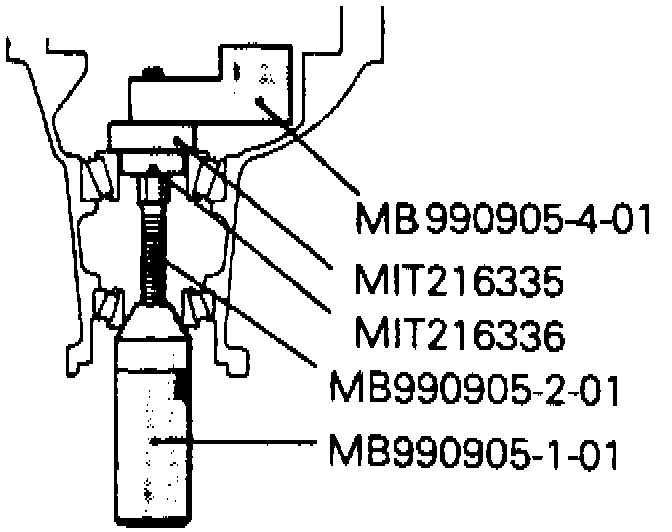 d. Position gauge tube tool No. MB990392-01, or equivalent, in side bearing seat of gear carrier, then select a drive pinion rear shim of thickness which corresponds to gap between special tools.