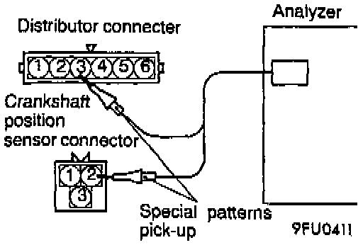 4. Connect the analyzer special patterns pickup to crankshaft position sensor connector terminal 2. (in order to inspect the crankshaft position sensor signal wave pattern.)