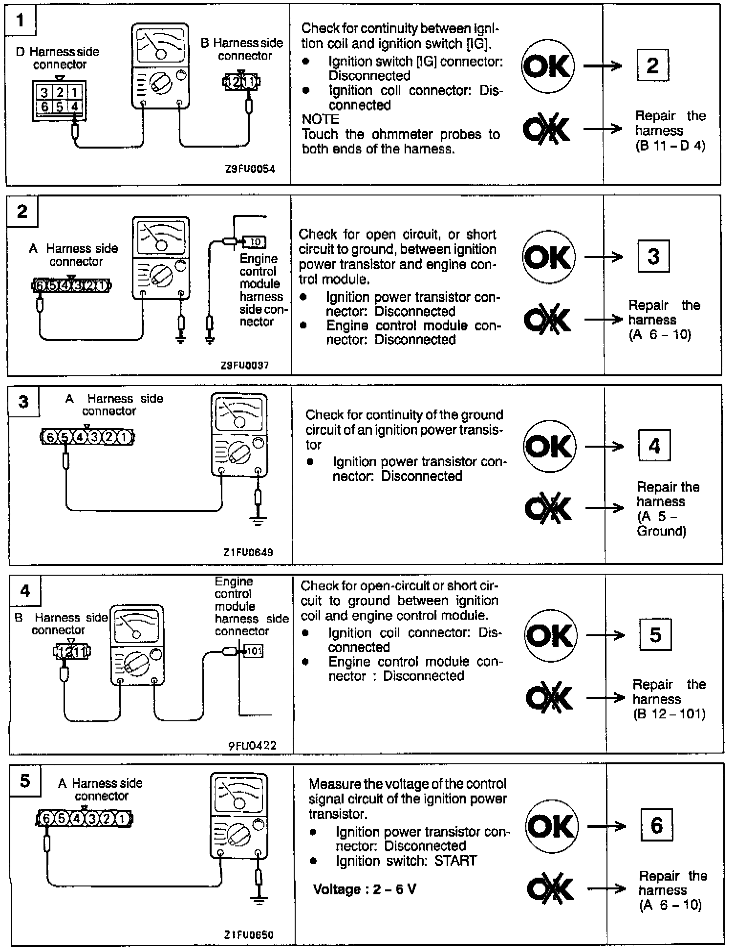 1. Disconnect the ignition power transistor connector, and connect the special tool (test harness: MB991348) in between. (All terminals should be connected.)