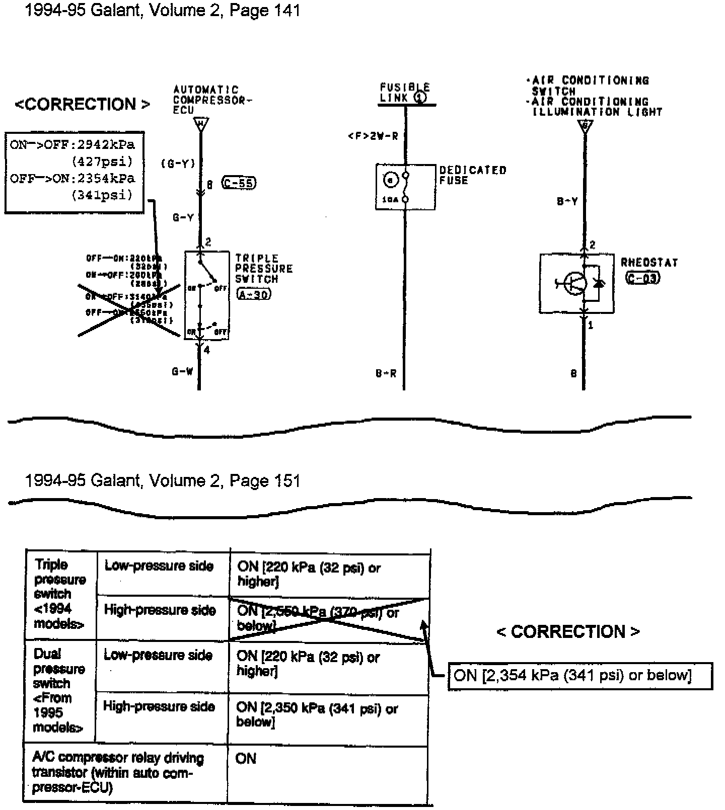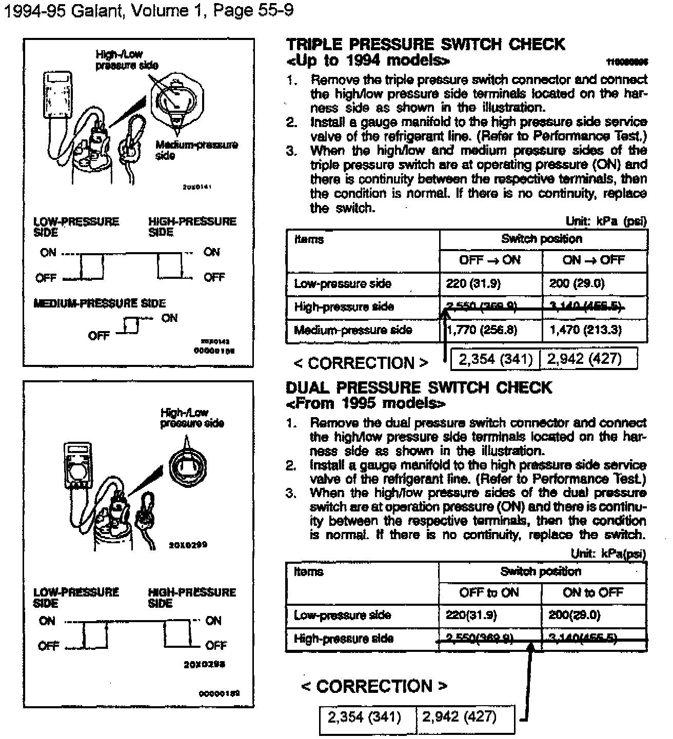 New A/C receiver pressure switches (triple-pressure switch on 94 models and dual-pressure switch on 95 models) were developed to simplify parts supply and usage among various models. These new switches are installed on all Galants produced after April 18, 1994. The old and new style switches are interchangeable, however the new switches have a different operating high pressure range from the old style switches.