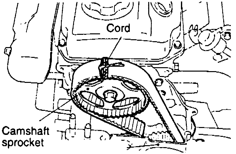 a. When removing camshaft sprocket, rotate crankshaft in direction of normal rotation until timing marks align, then secure timing belt to sprocket as shown in Fig. 11 to maintain relative position of sprocket to belt.