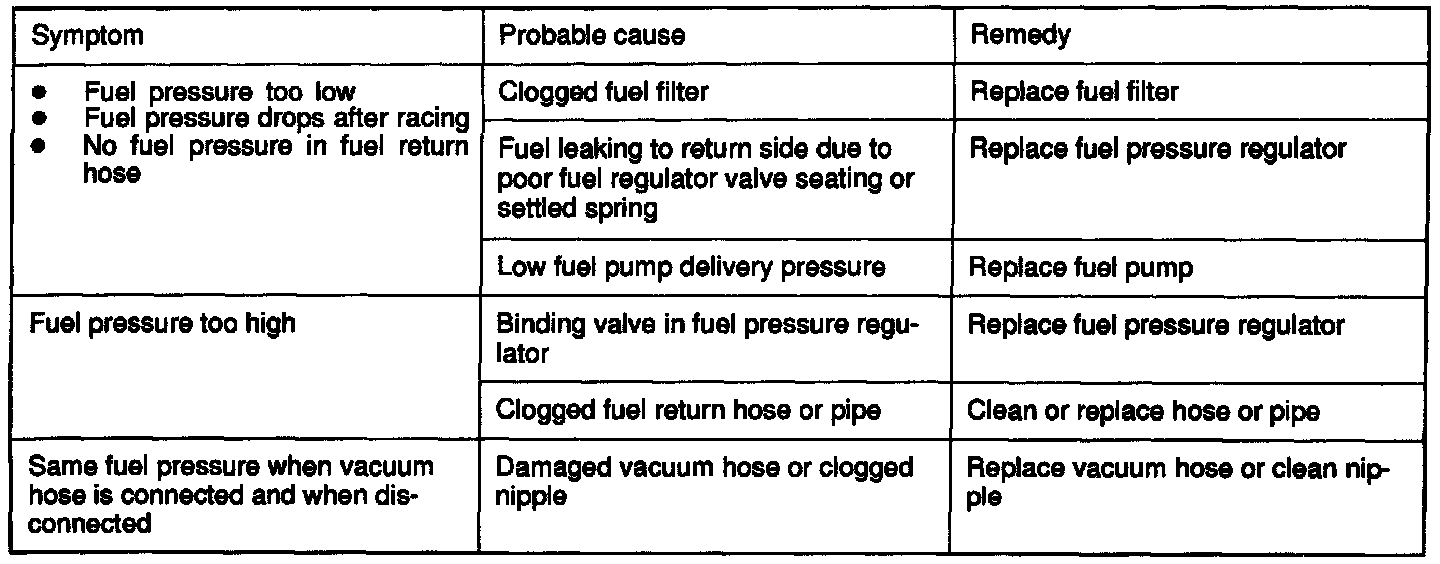 13. If any of fuel pressure measured in steps 8 to 11 is out of specification, troubleshoot and repair according to the table above.