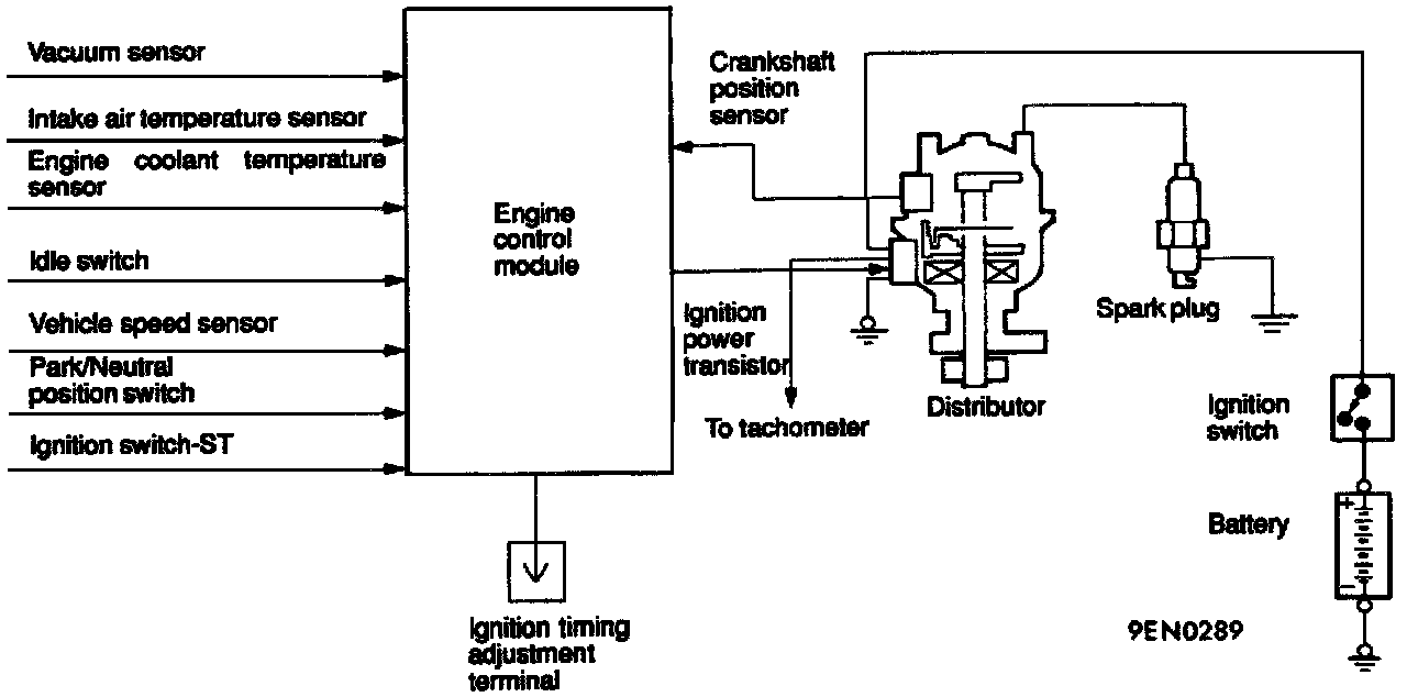 The engine control module detects the crankshaft position by the crankshaft position sensor incorporated in the distributor to provide ignition at the most appropriate timing for the engine operating condition.