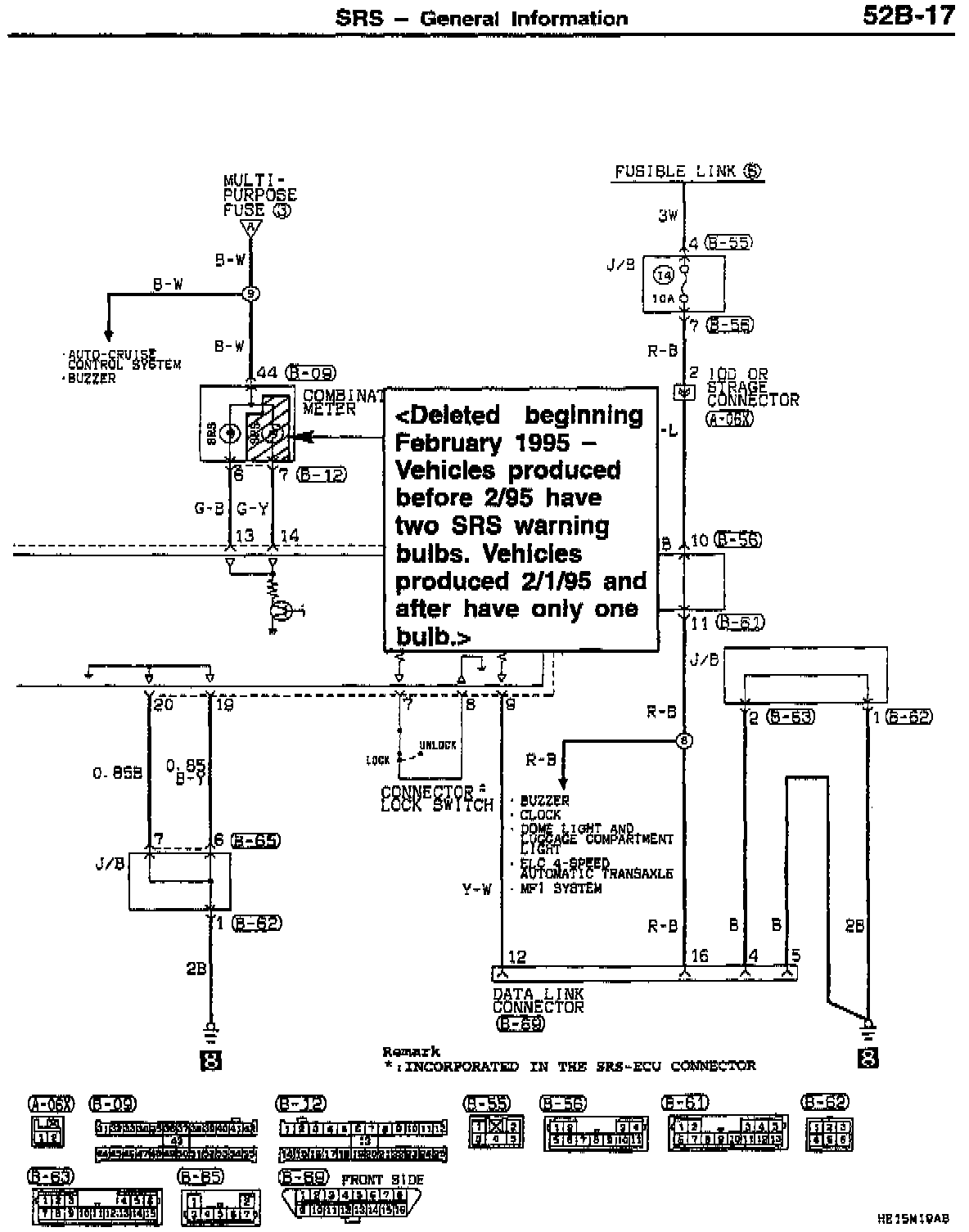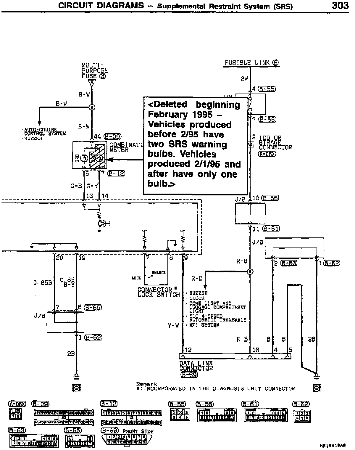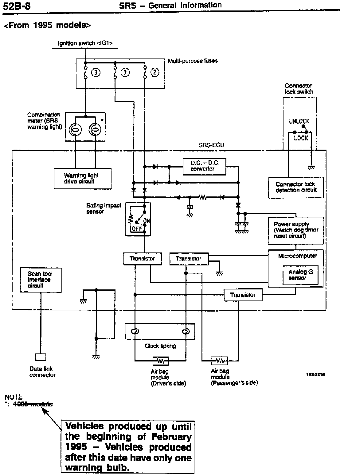 The number of Supplemental Restraint System (SRS) warning lamps in the combination meter was decreased from 2 to 1 beginning with February 1995 production. This bulletin revises the service manual circuit diagrams to reflect this change.
