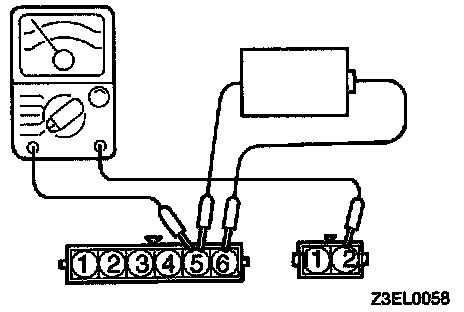 NOTE: An analog-type circuit tester should be used.1. Connect the negative (-) terminal of the 1.5V power supply to terminal 5 of the ignition power transistor; then check whether there is continuity between terminal 5 and terminal 12 when terminal 6 and the positive (+) terminal are connected and disconnected.