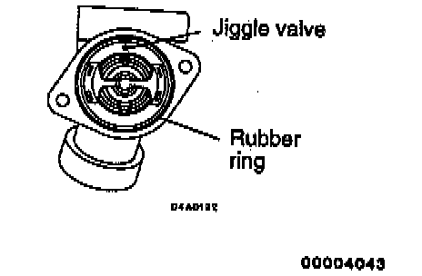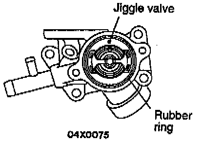 4. Install the thermostat so that the jiggle valve is facing straight up and is aligned with the mark on the thermostat case as shown in the illustrations.
