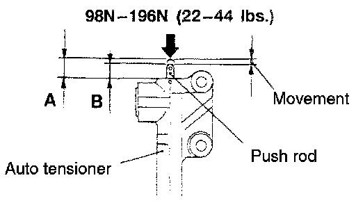 1. Apply 98-196 N (22-44 lbs) force to the auto tensioner by pressing it against a metal object (cylinder block,..etc.), and measure the movement of the push rod.