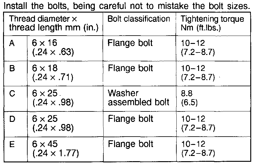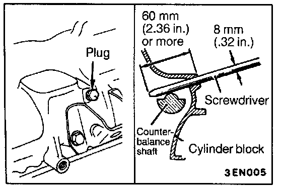 2. After aligning the timing mark on the oil pump sprocket, remove the cylinder block plug and insert a Phillips screwdriver with a diameter of 8 mm (.32 in), and check to be sure that the screwdriver goes in 60 mm (2.36 in) or more. If the screwdriver will only go in 20 - 25 mm (.79-.98 in) before striking the counterbalance shaft, turn the sprocket once, realign the timing mark and check that the screwdriver goes in 60 mm (2.36 in) or more. Do not take out the screwdriver until the timing belt is installed.