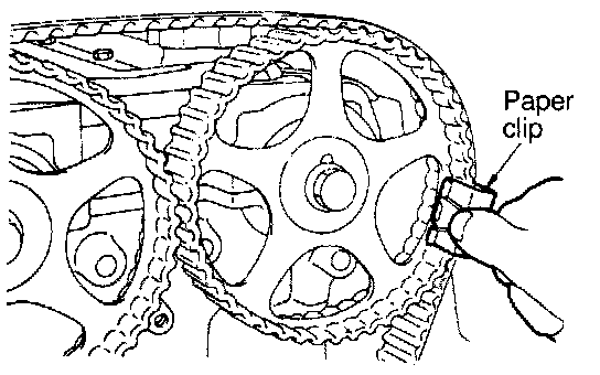 a. Install the timing belt around the intake side camshaft sprocket and fix it at indicated position by a spring type paper clip (binder clip).