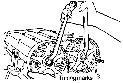 b. Install the timing belt around the exhaust side sprocket, aligning the timing marks with the cylinder head top surface using two wrenches.