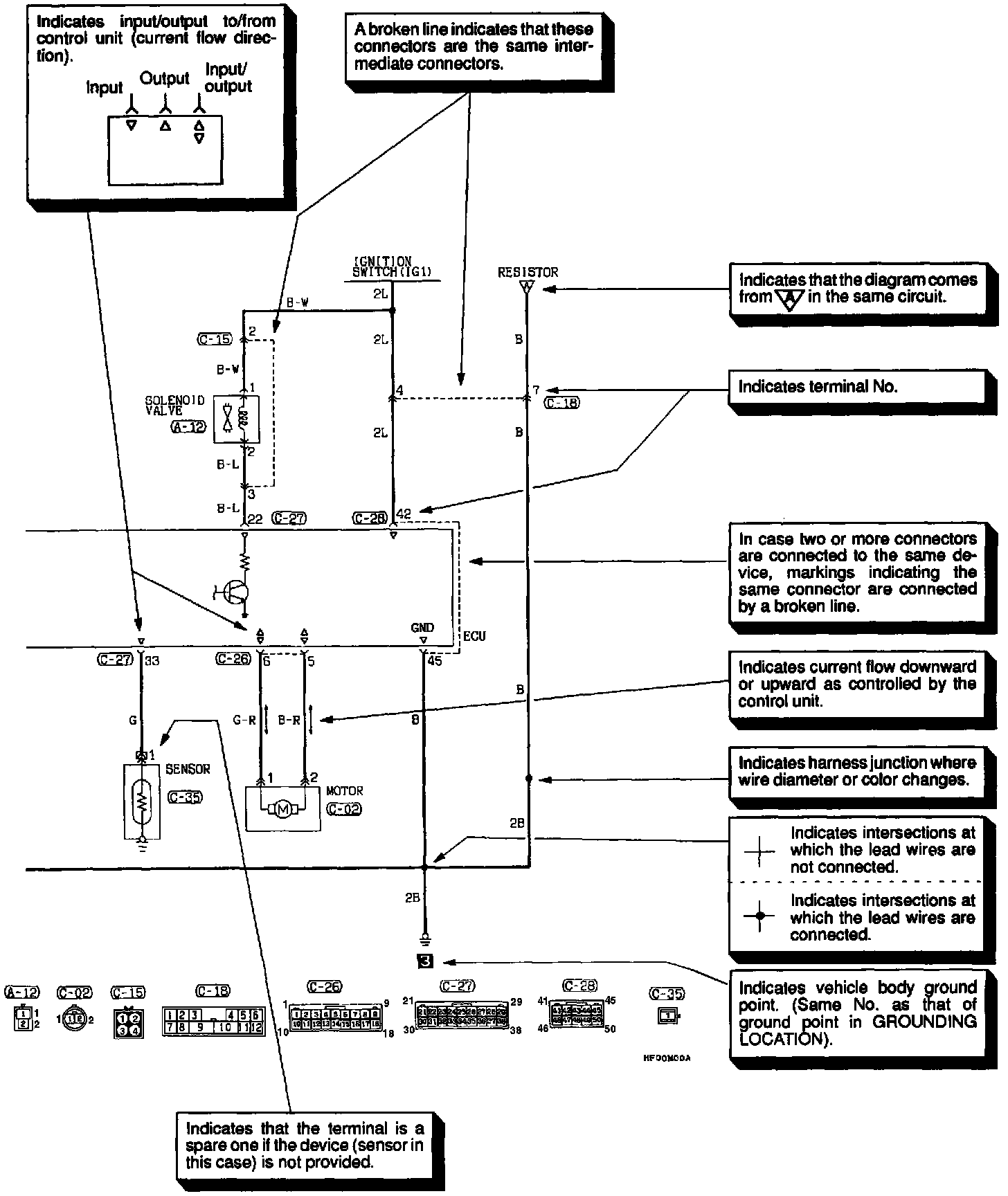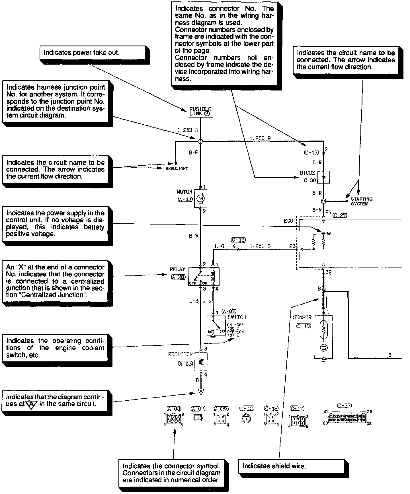 The circuit of each system from the fuse (or fusible link) to ground is shown. The power supply is shown at the top and the ground at the bottom to facilitate understanding of how the current flows.