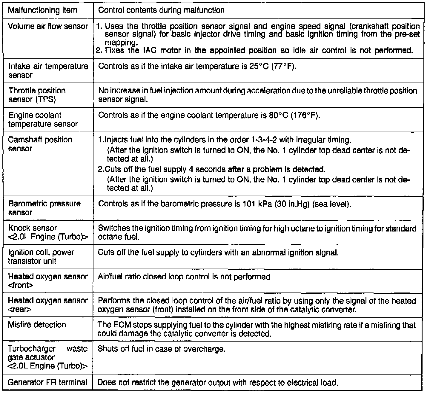 When main sensor malfunctions are detected by the diagnostic test mode, the vehicle is controlled by these defaults.