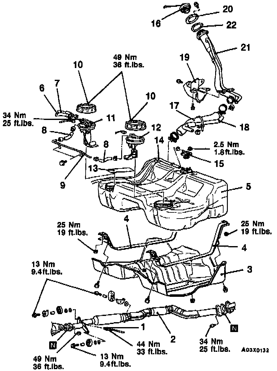 NOTE: When replacing the fuel gauge unit and pump assembly or the fuel gauge unit and pipe assembly only, it is possible to work from the service holes underneath the rear seat cushion without having to remove the fuel tank.