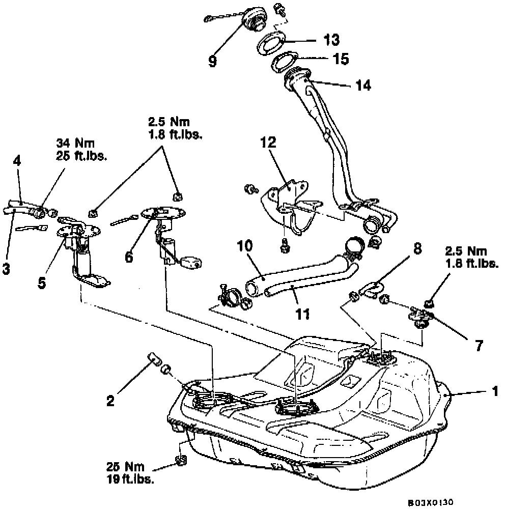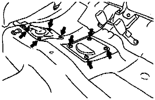 NOTE: When replacing the fuel pump assembly or the fuel gauge unit only, it is possible to work from the service holes underneath the rear seat cushion without having to remove the fuel tank.