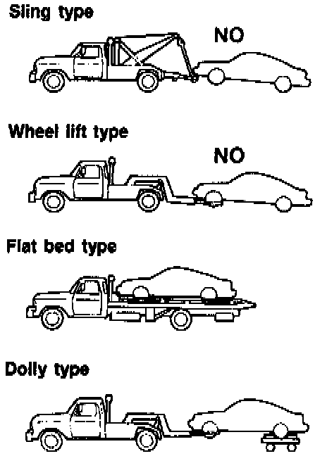 If this vehicle is towed, use wheel lift type, flat bed type or dolly type equipment.