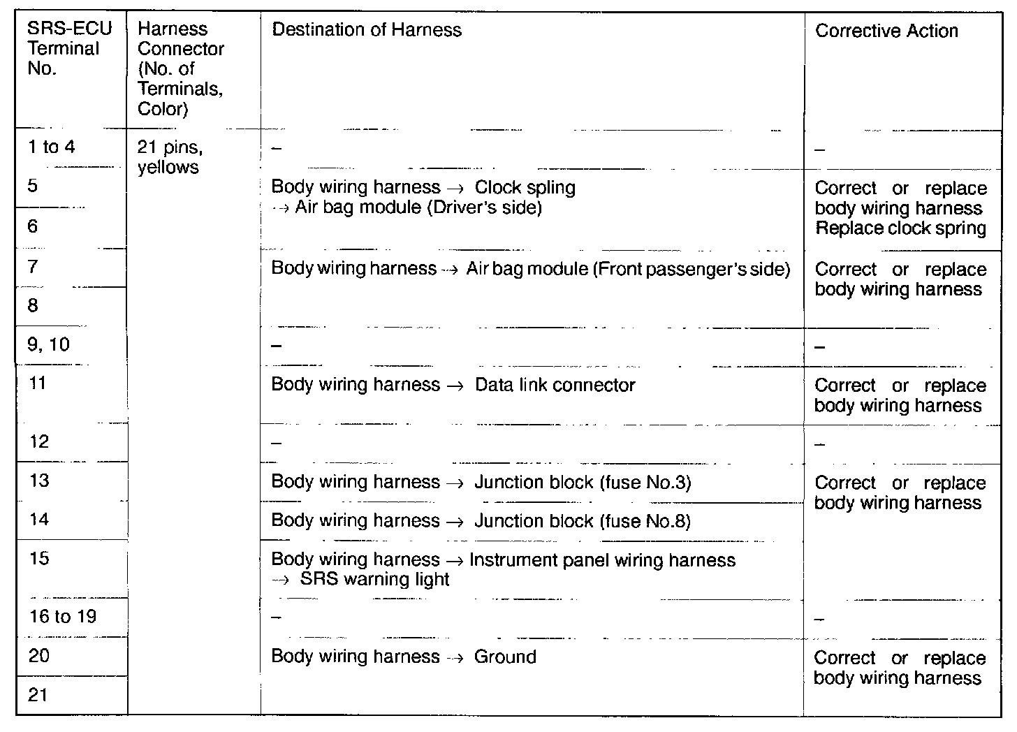 4. Do not attempt to repair the wiring harness connectors of the SRS. If any of the connectors are diagnosed as faulty, replace the wiring harness. If the wires are diagnosed as faulty, replace or repair the wiring harness according to the table above.