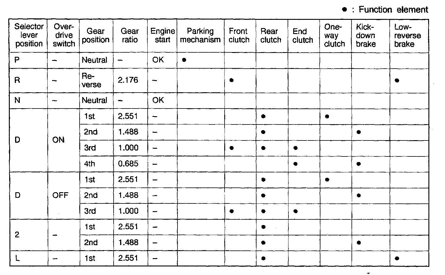 F4A23/F4A33 4-spd A/T, Function Element Table: