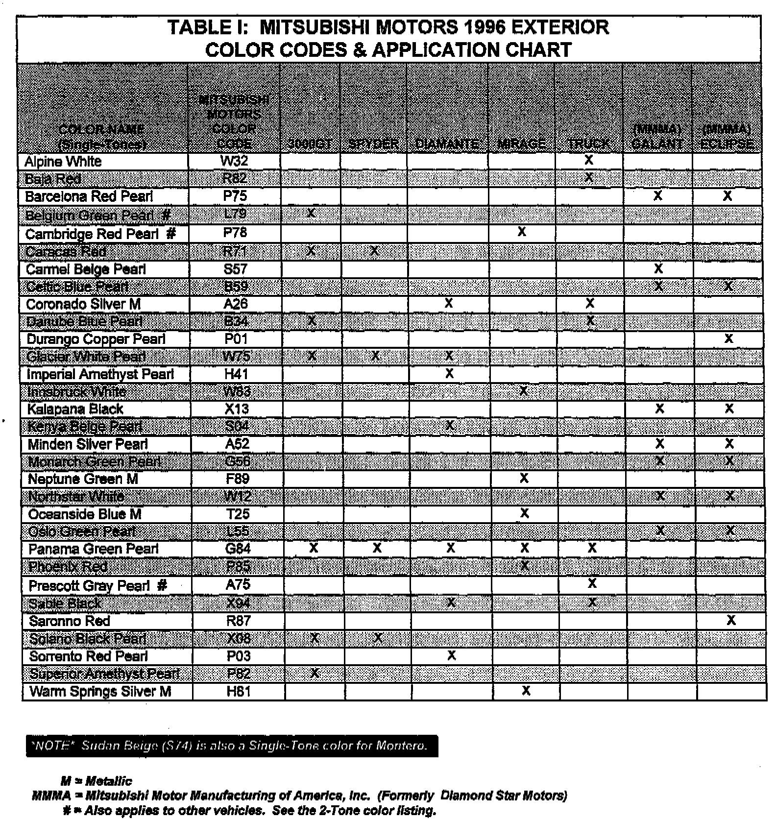 This bulletin contains complete exterior color information on all 1996 Mitsubishi Motors vehicles.