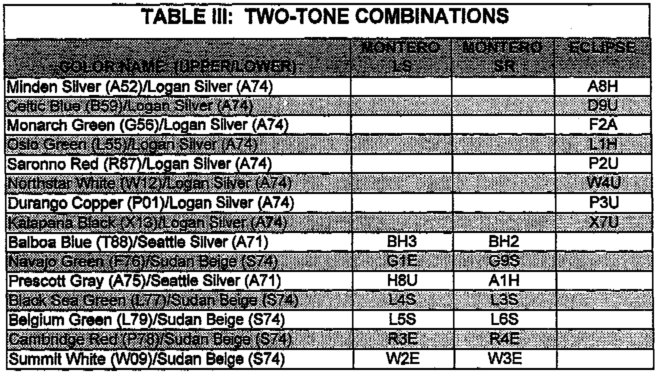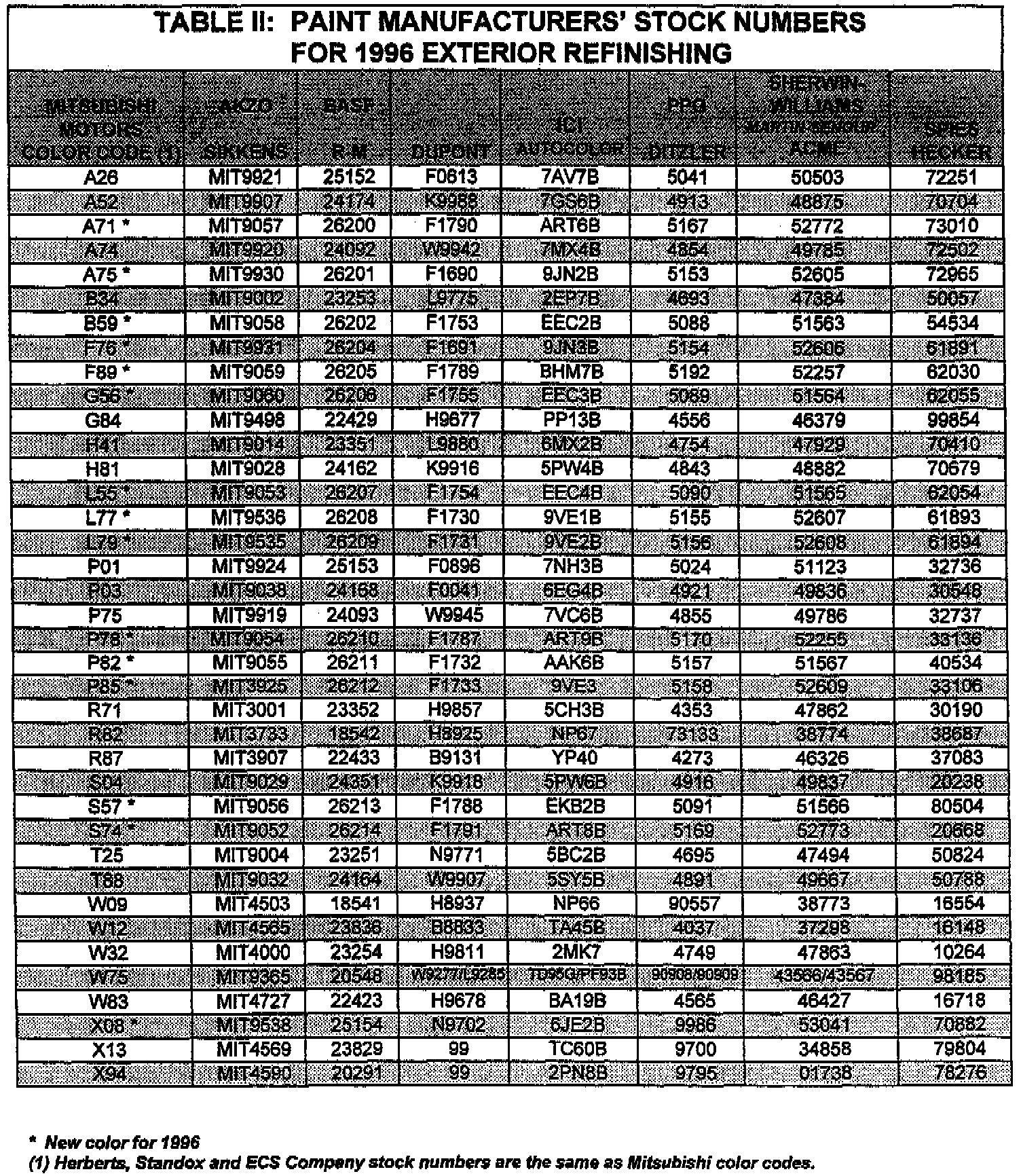 In Table II, the new colors are identified by an asterisk (*). Also included in Table II are the manufacturers' stock numbers which correspond with the Mitsubishi Motors Color Codes shown in Table I.