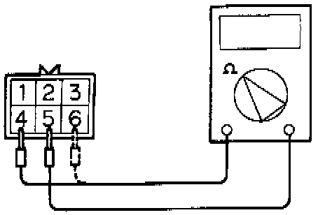 3. Measure the resistance between terminal 5 (green clip of the special tool) and either terminal 6 (yellow clip) or terminal 4 (black clip) of the connector at the idle air control motor side.