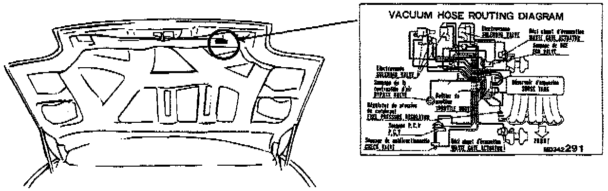 1. Open the hood, locate the Vacuum Hose Routing Diagram label, and inspect the part number printed on the label. If the part number is MD327296, proceed with step 2 and install the new label. If the part number is MD342291,the label is the new correct label and does not require replacement.