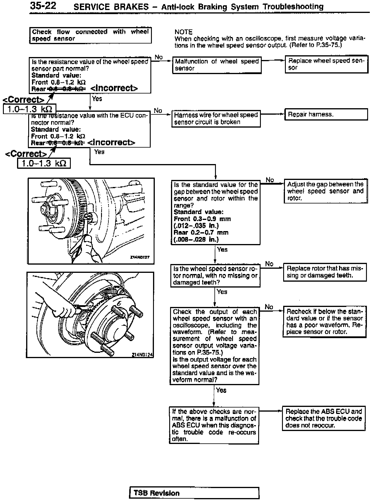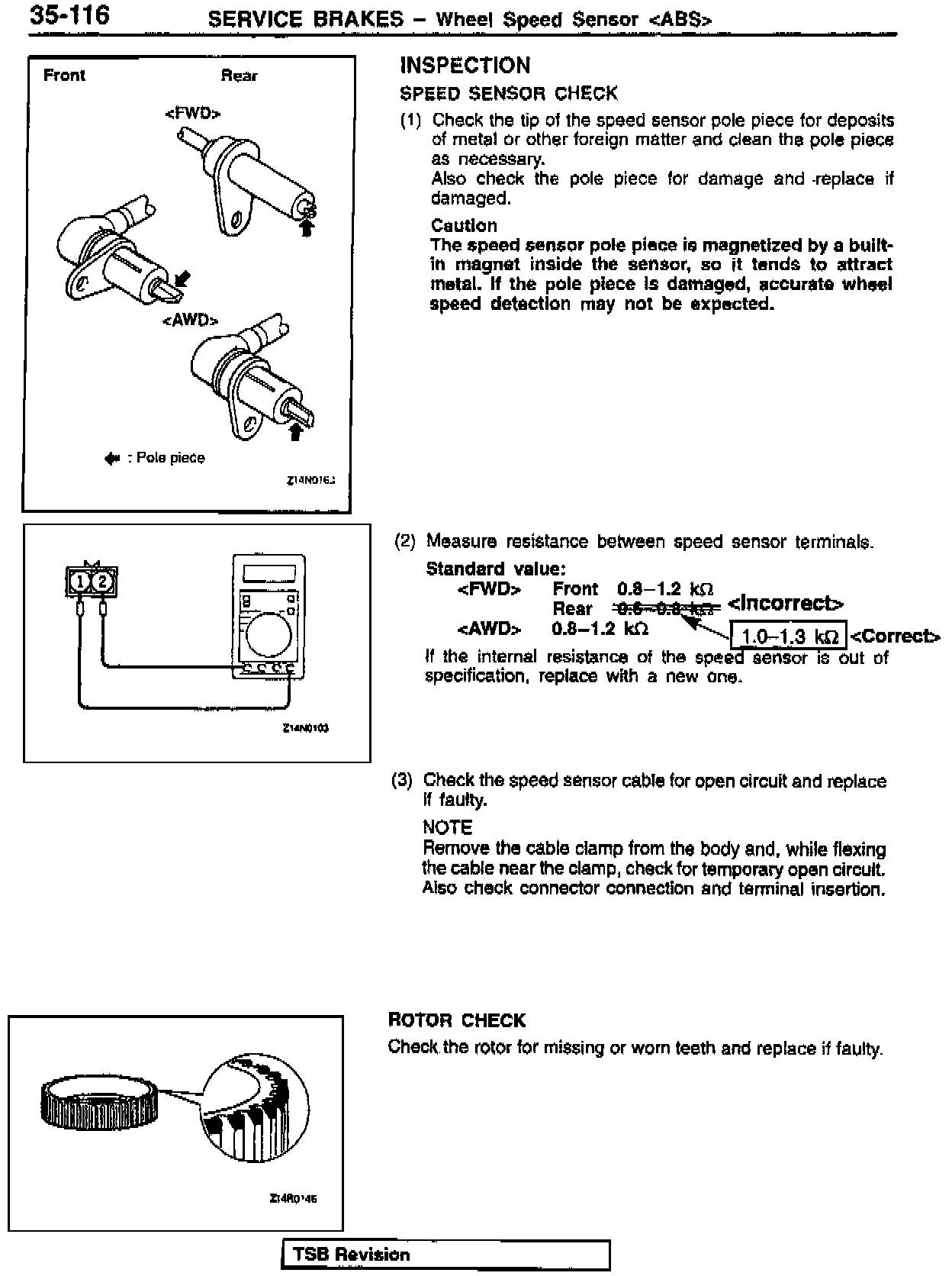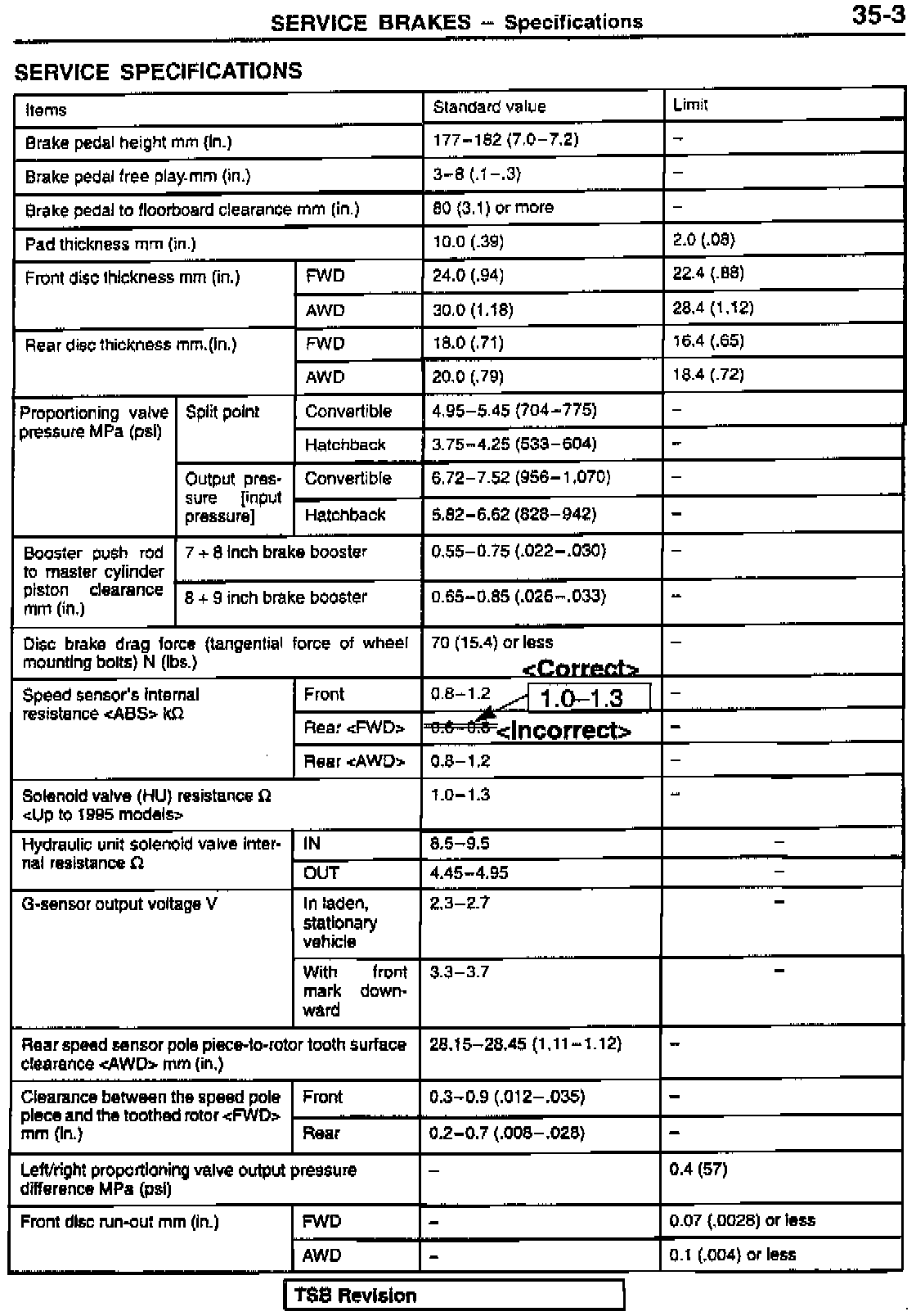 This bulletin contains revised resistance values for the rear wheel ABS speed sensor. The correct resistance value is 1.0 - 1.3k