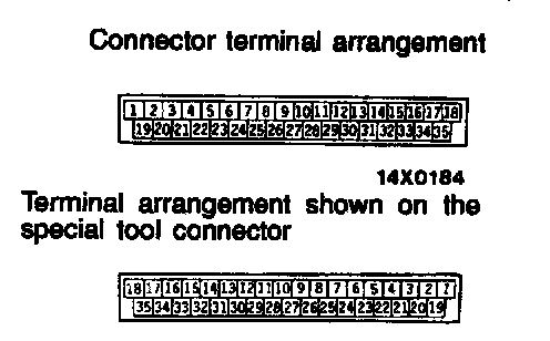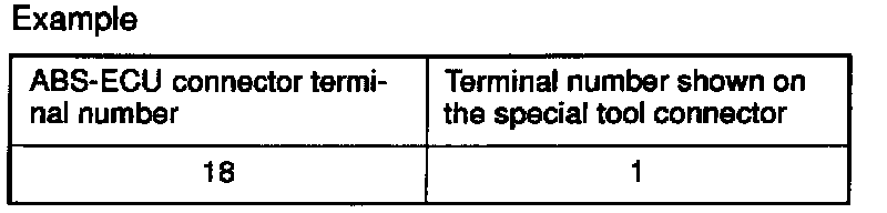 2. The ABS-ECU connector terminal arrangement for troubleshooting is different from the terminal arrangement shown on the special tool connector. So take the readings from the terminal numbers of the special tool when checking.