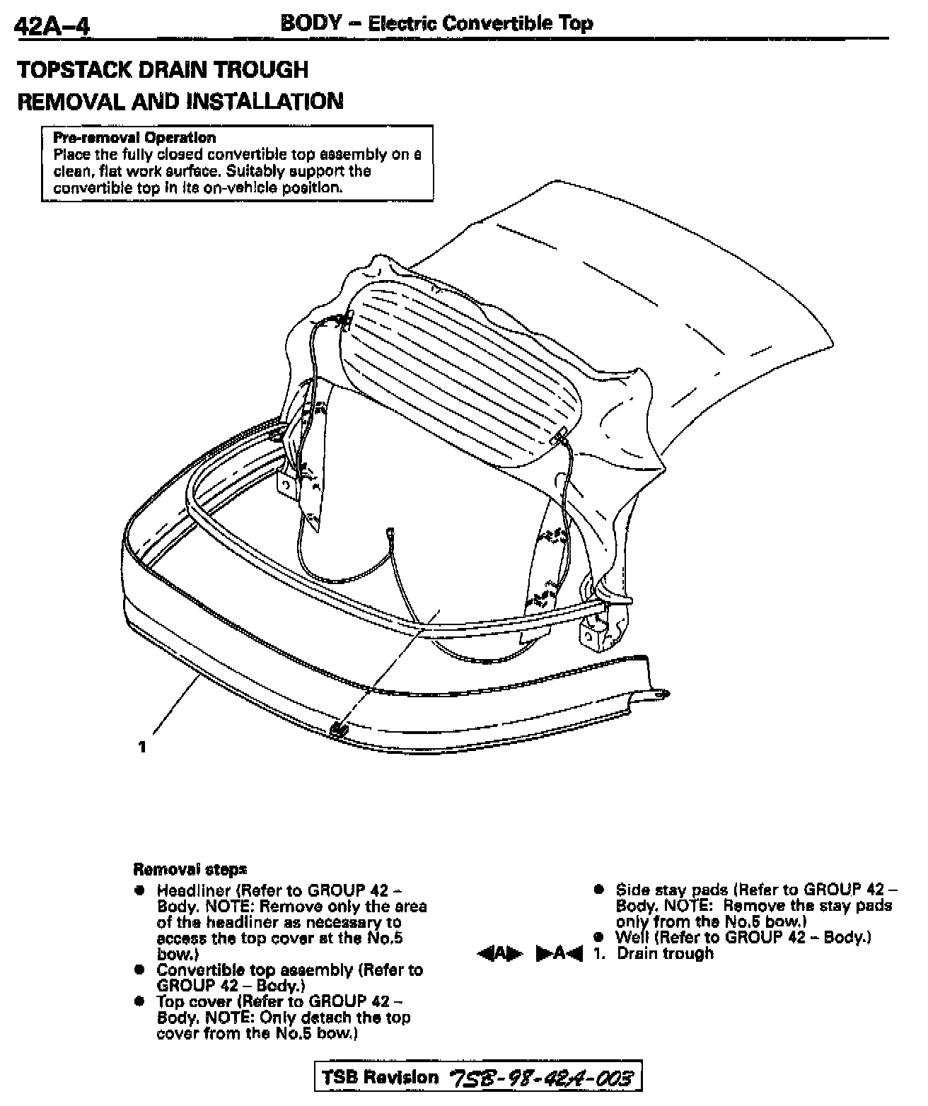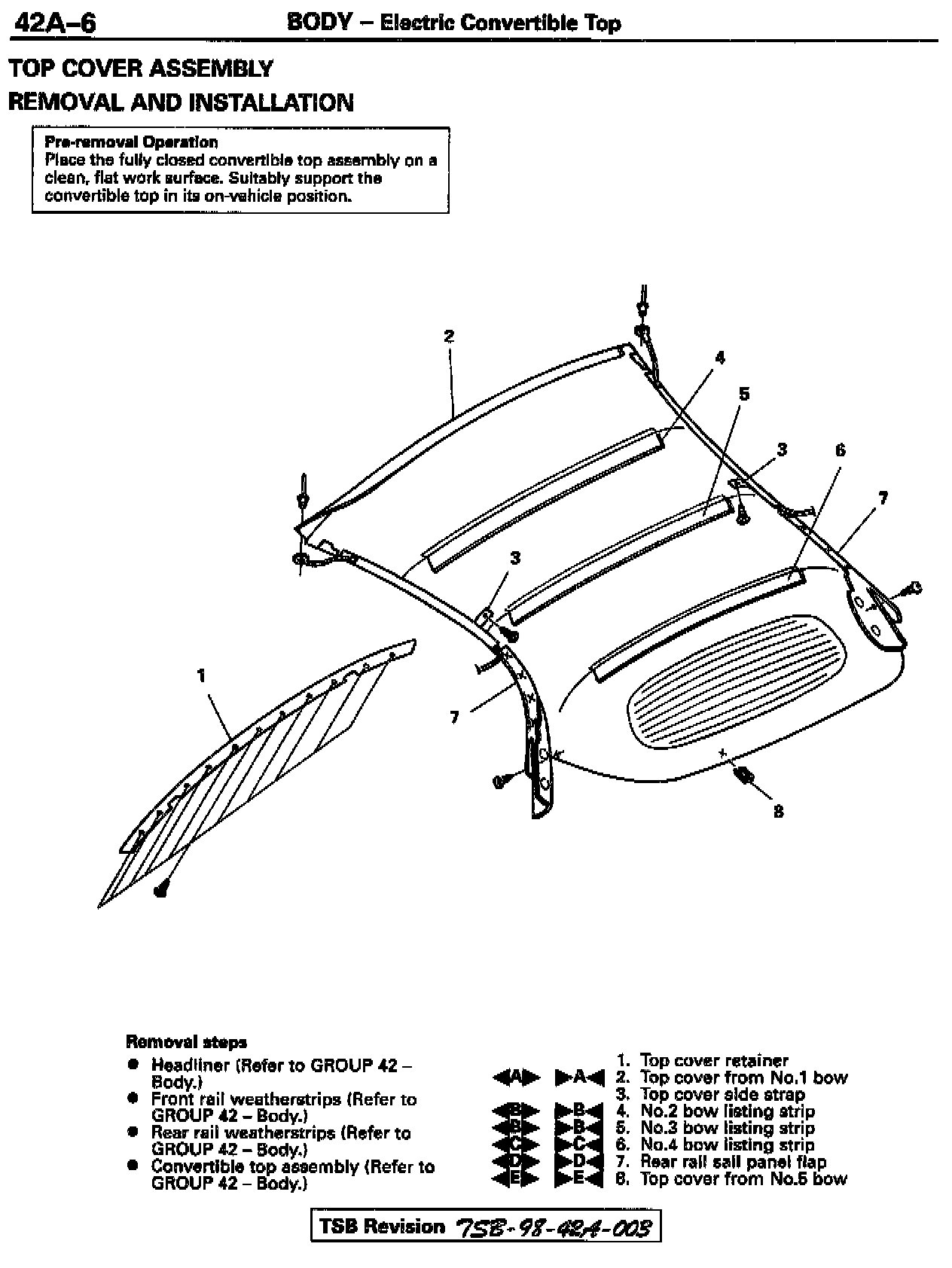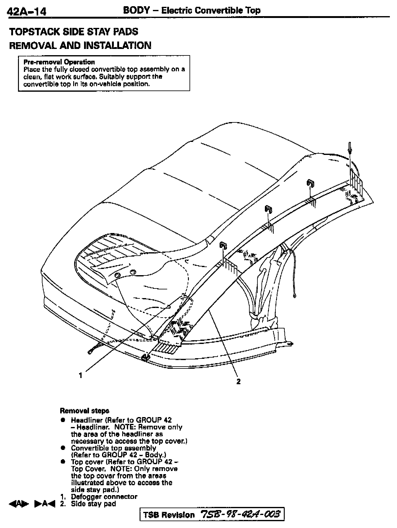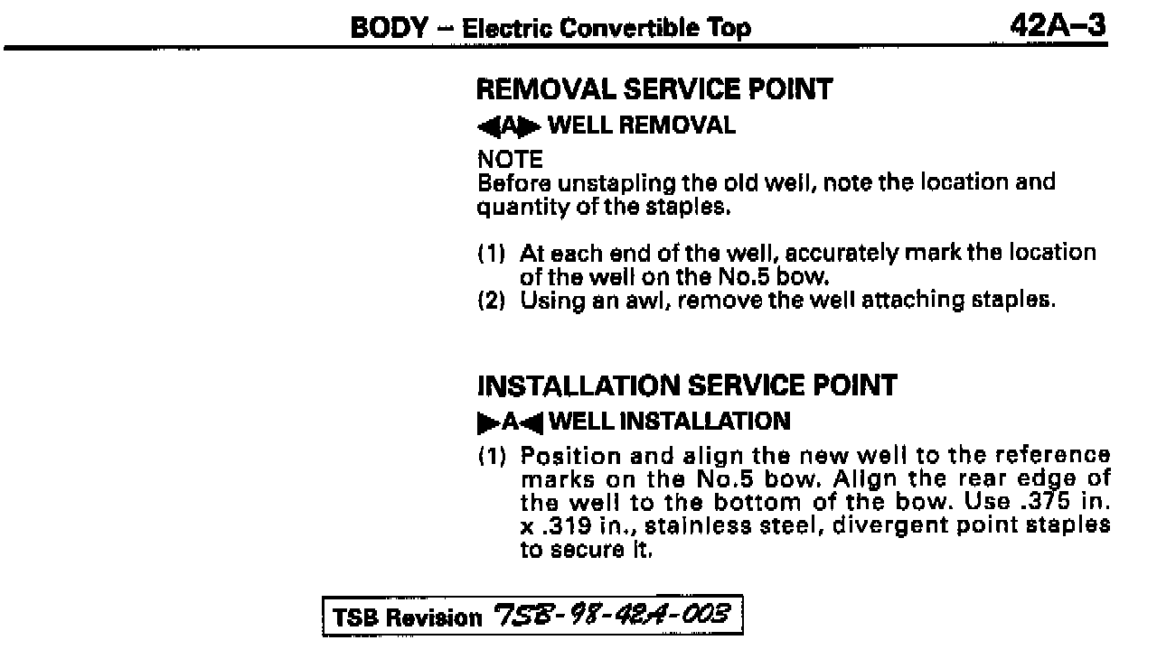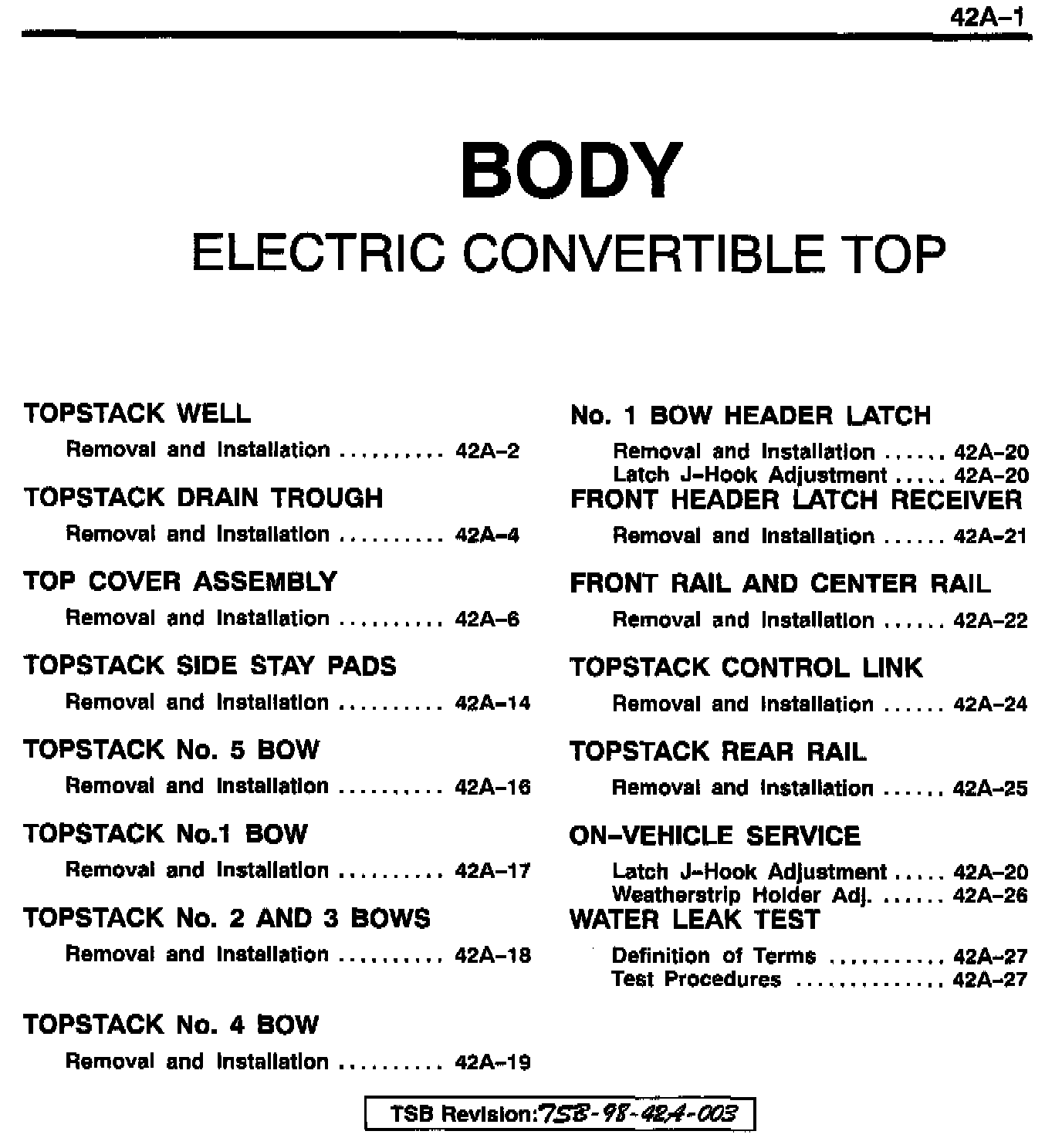 This bulletin contains new disassembly, reassembly, and service information about the 1996-98 Eclipse Spyder electric convertible top. This information was not included in the original service manuals. These new pages should be used as a service manual supplement placed at the end of the 42 Body section. These pages will be included in the 1999 service manual.