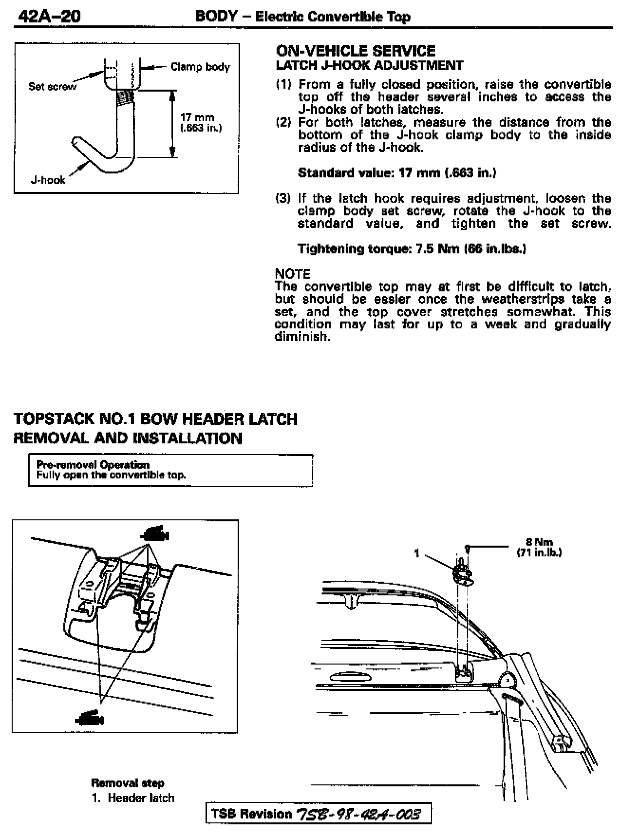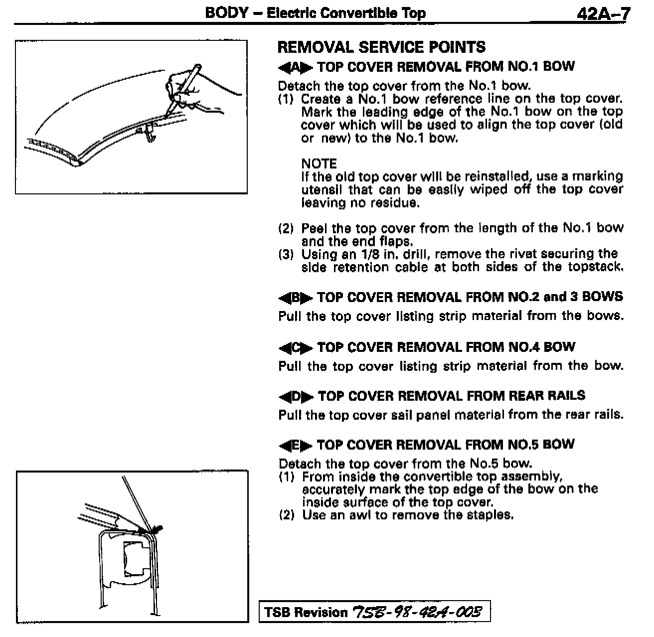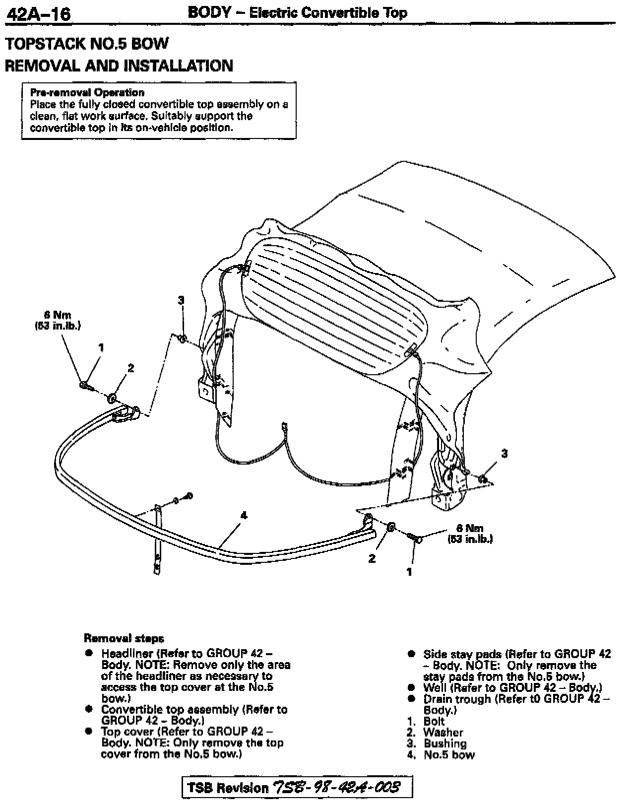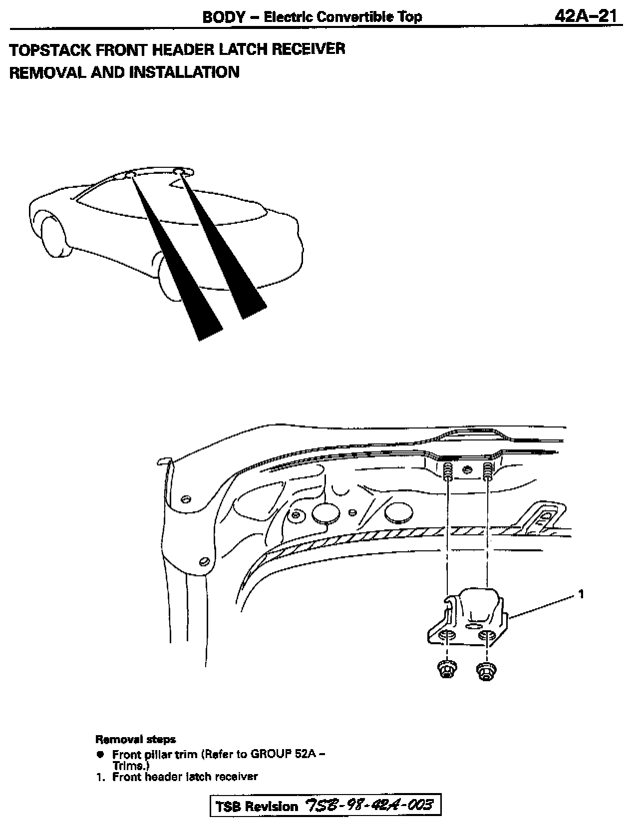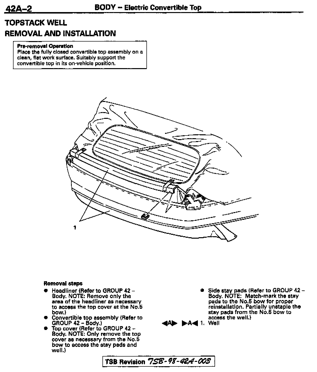 This bulletin contains new disassembly, reassembly, and service information about the 1996-98 Eclipse Spyder electric convertible top. This information was not included in the original service manuals. These new pages should be used as a service manual supplement placed at the end of the 42 Body section. These pages will be included in the 1999 service manual.
