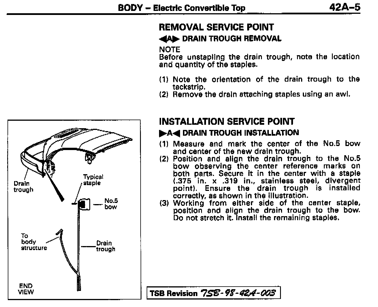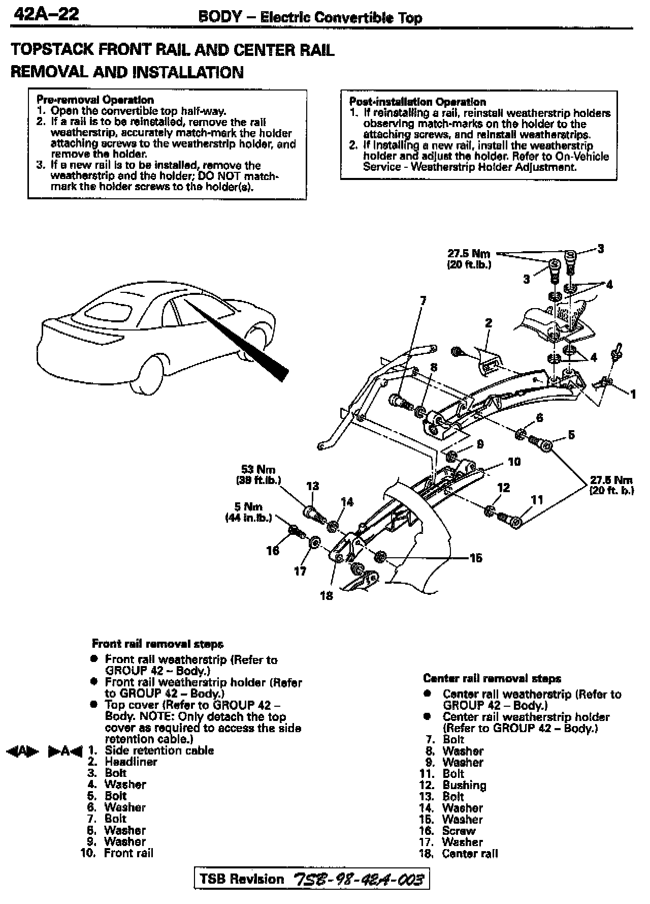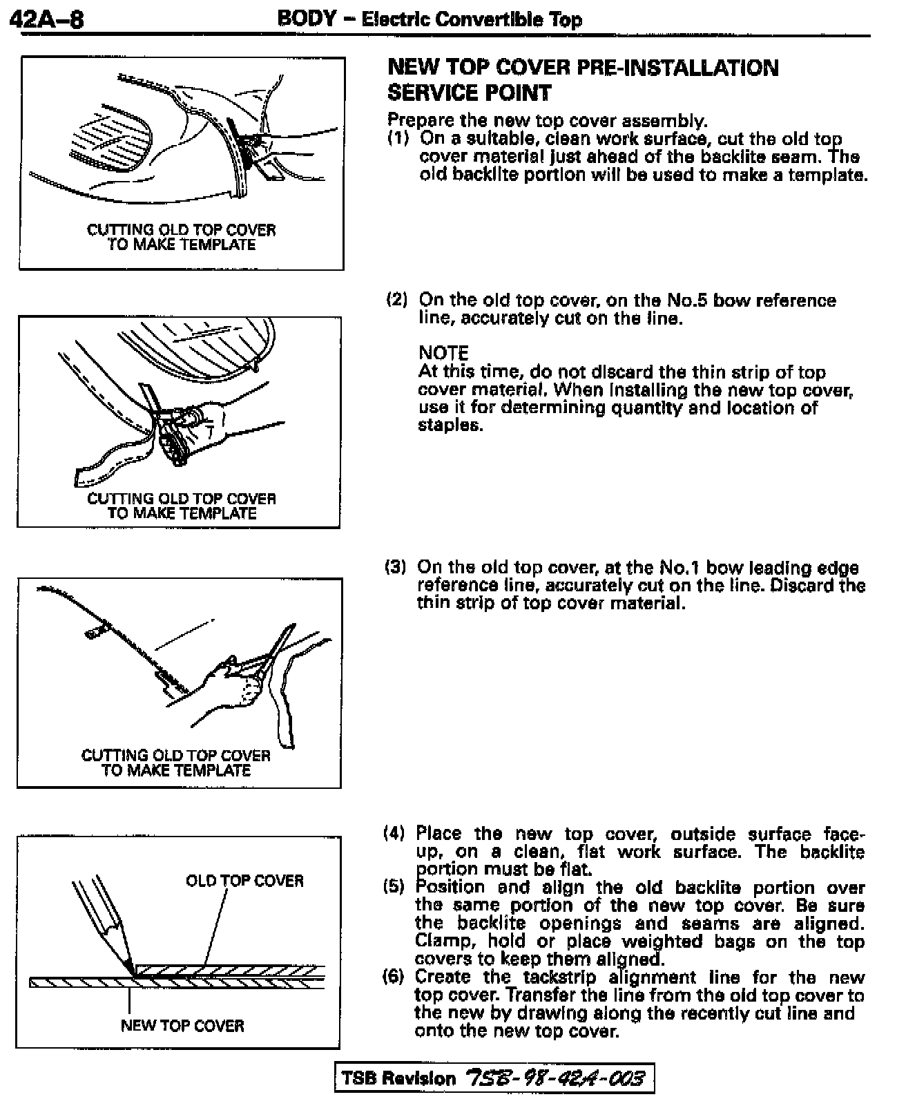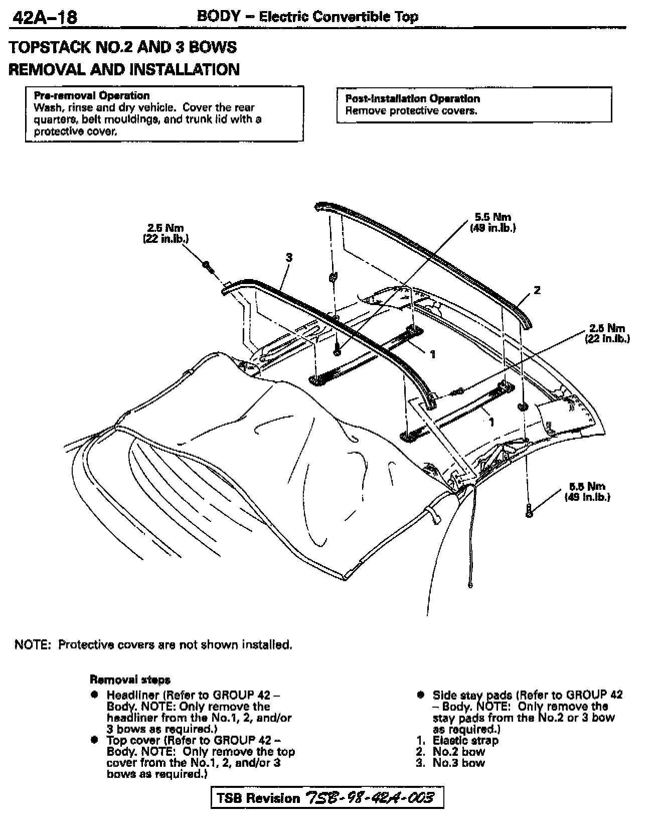 This bulletin contains new disassembly, reassembly, and service information about the 1996-98 Eclipse Spyder electric convertible top. This information was not included in the original service manuals. These new pages should be used as a service manual supplement placed at the end of the 42 Body section. These pages will be included in the 1999 service manual.