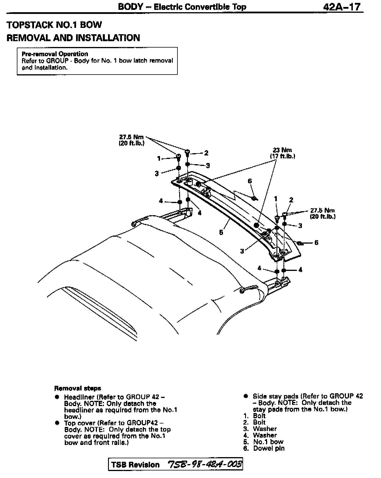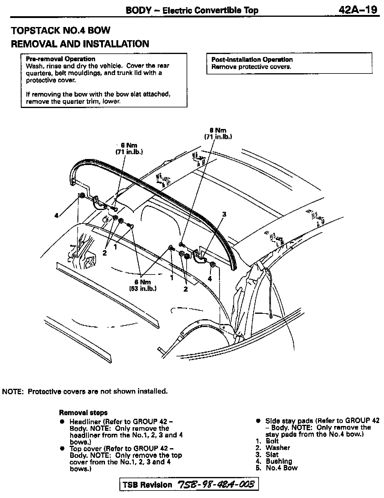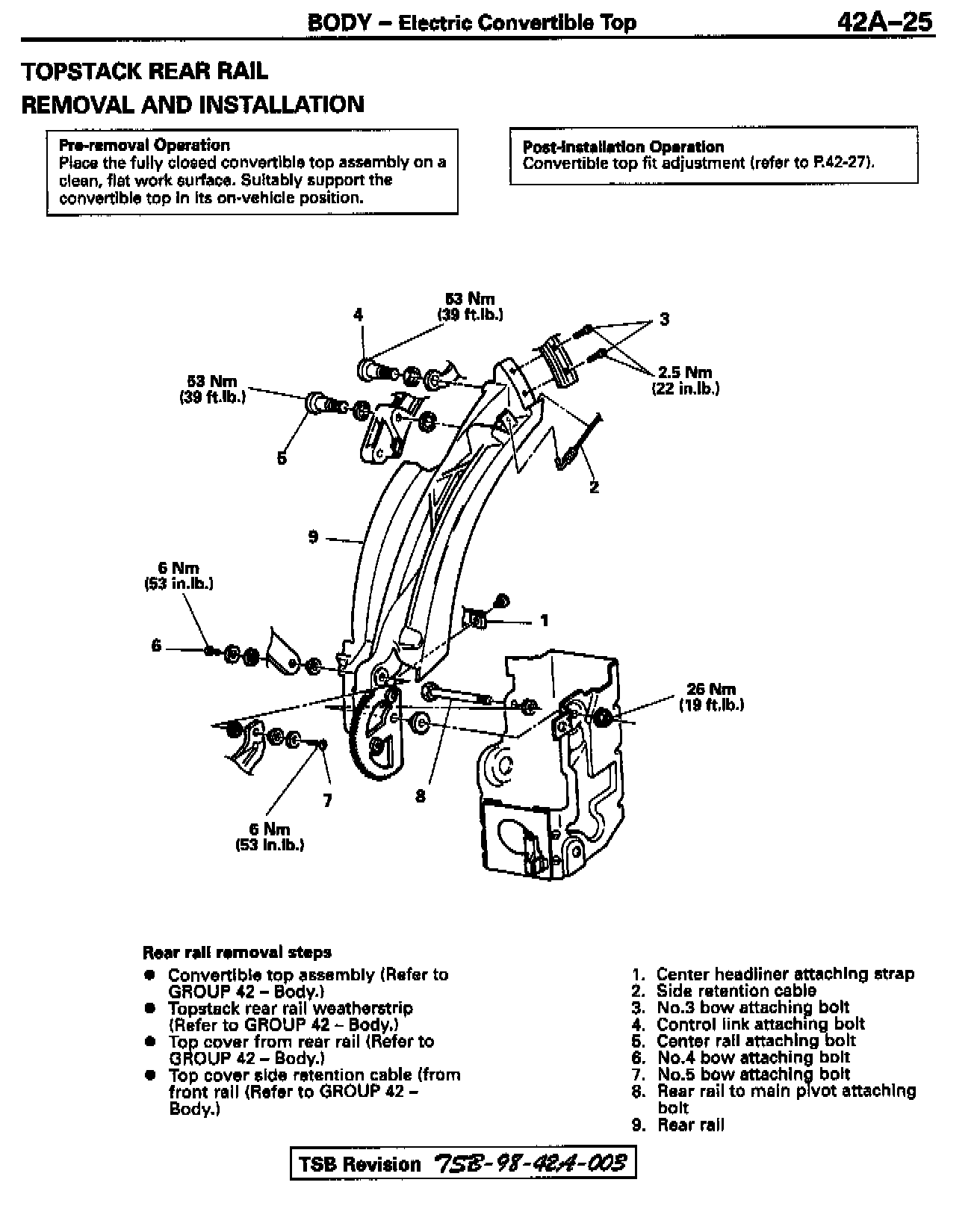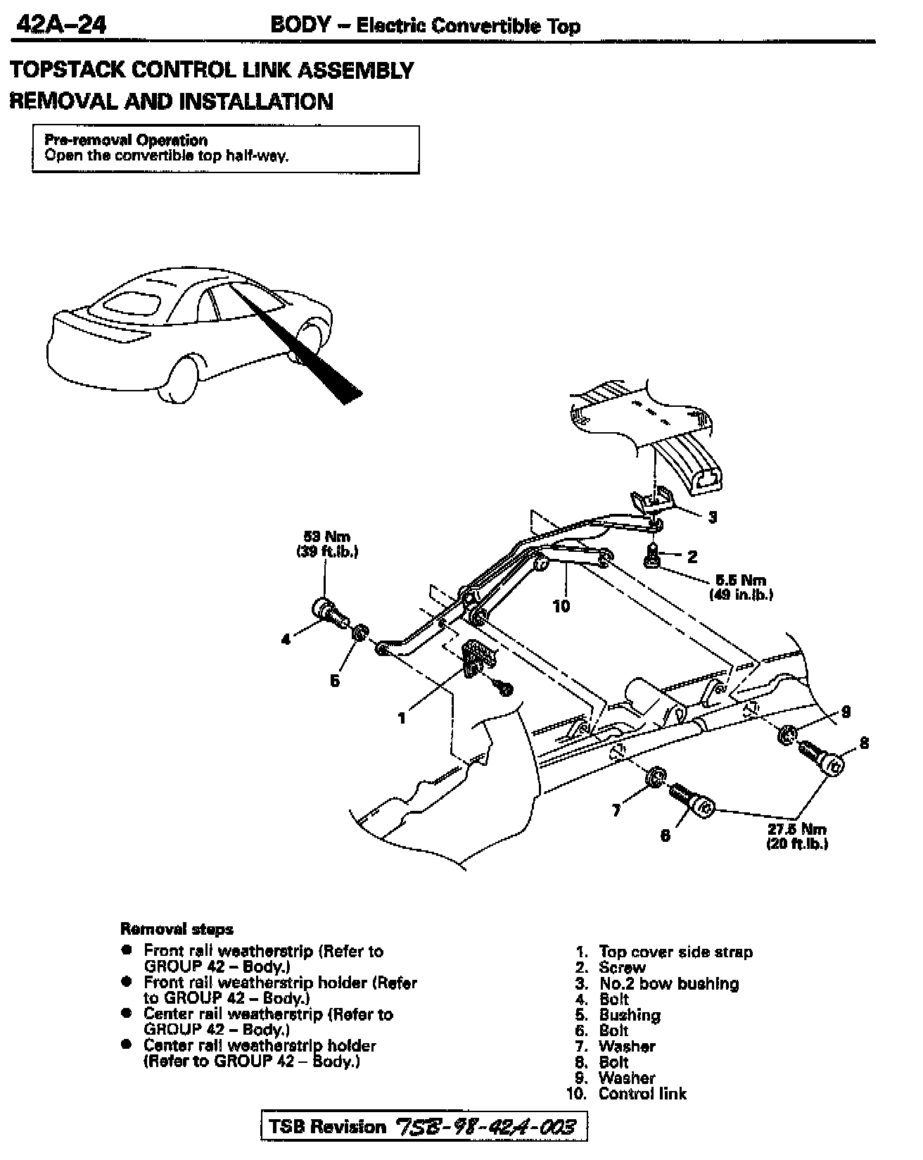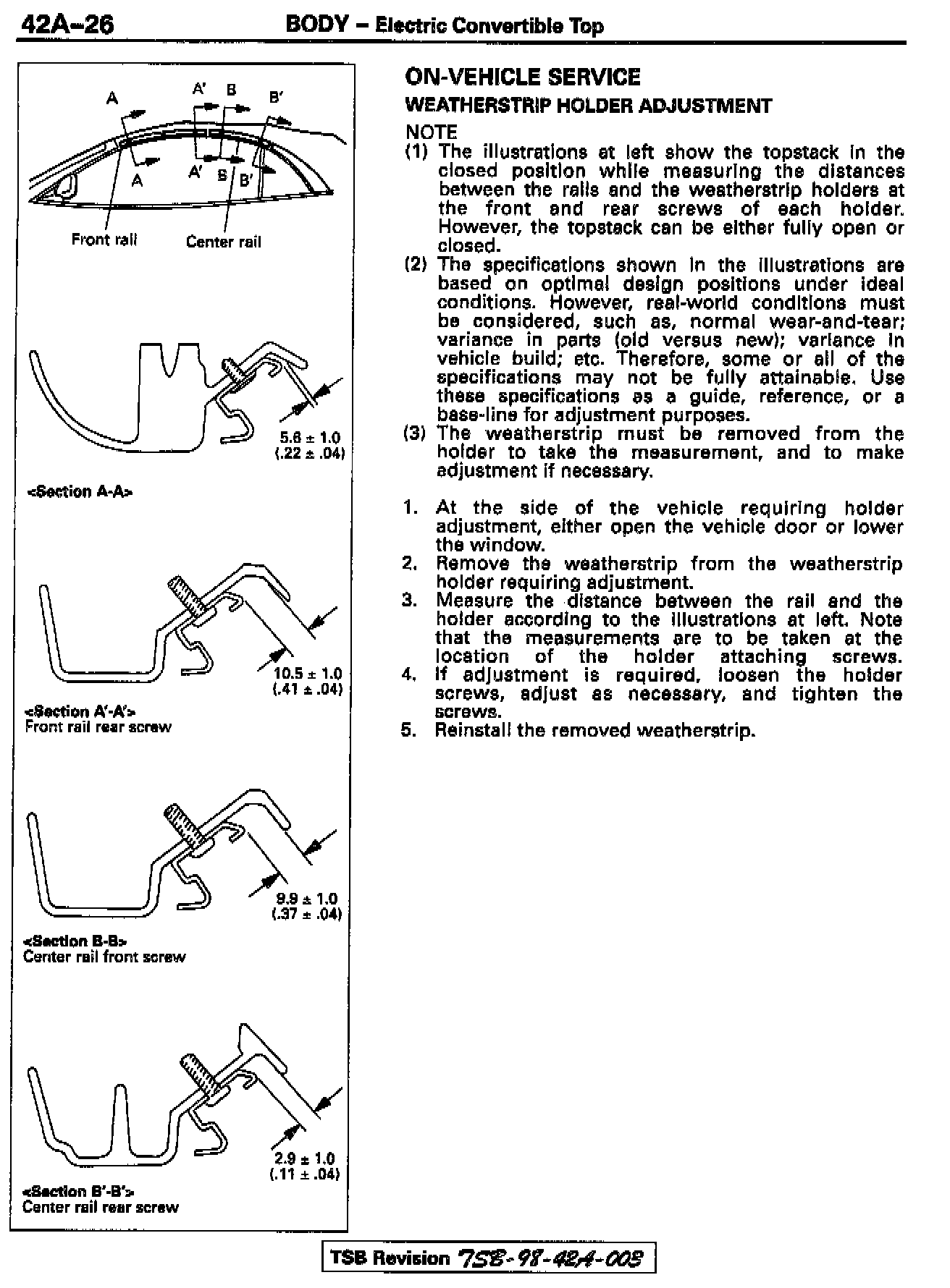 This bulletin contains new disassembly, reassembly, and service information about the 1996-98 Eclipse Spyder electric convertible top. This information was not included in the original service manuals. These new pages should be used as a service manual supplement placed at the end of the 42 Body section. These pages will be included in the 1999 service manual.