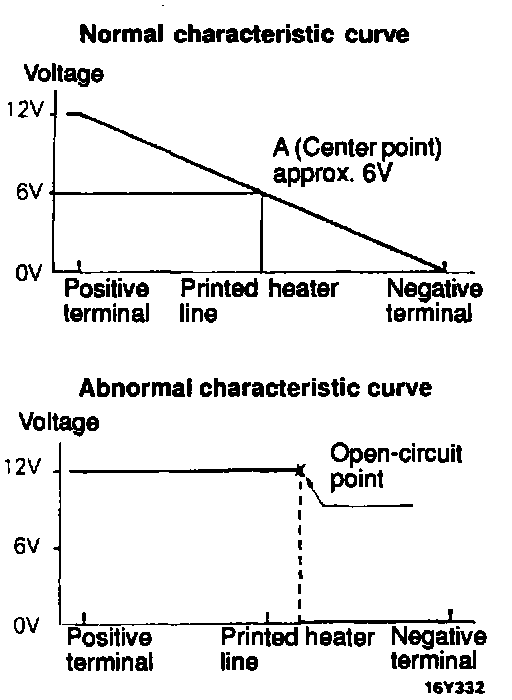 2. Turn ON rear window defogger switch. Measure heater element voltage with voltmeter at rear window glass center A.