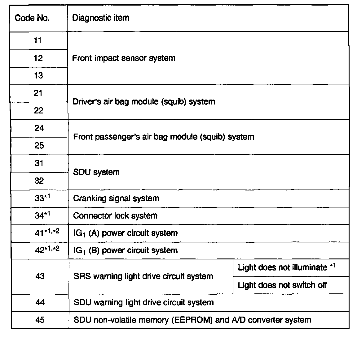 1. *1: For diagnostic trouble codes marked with *1, the vehicle condition returns to normal for a continuous period of 5 ± 0.2 seconds, the diagnostic trouble code will be automatically erased, and the SRS warning light will return to normal.