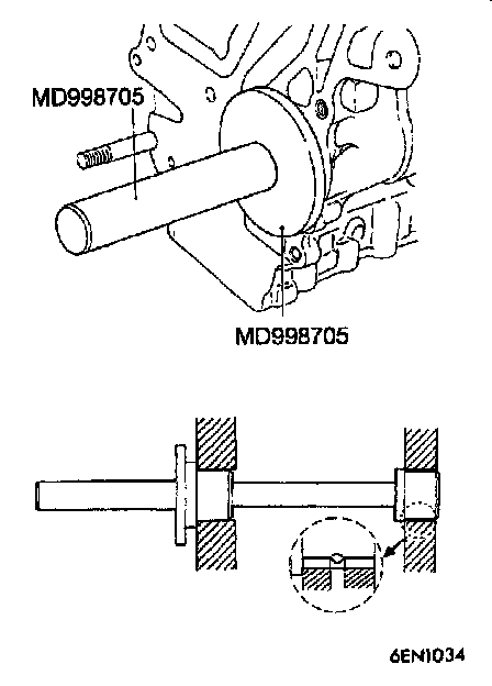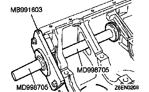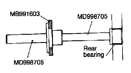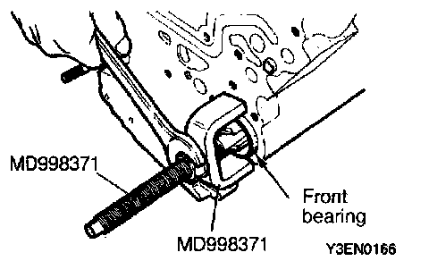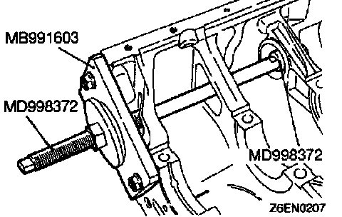 1. Using the special tool, remove the left silent shaft rear bearing from the cylinder block. When removing the left counterbalance shaft rear bearing attach the special tool (MB991603) to the front of the cylinder block.