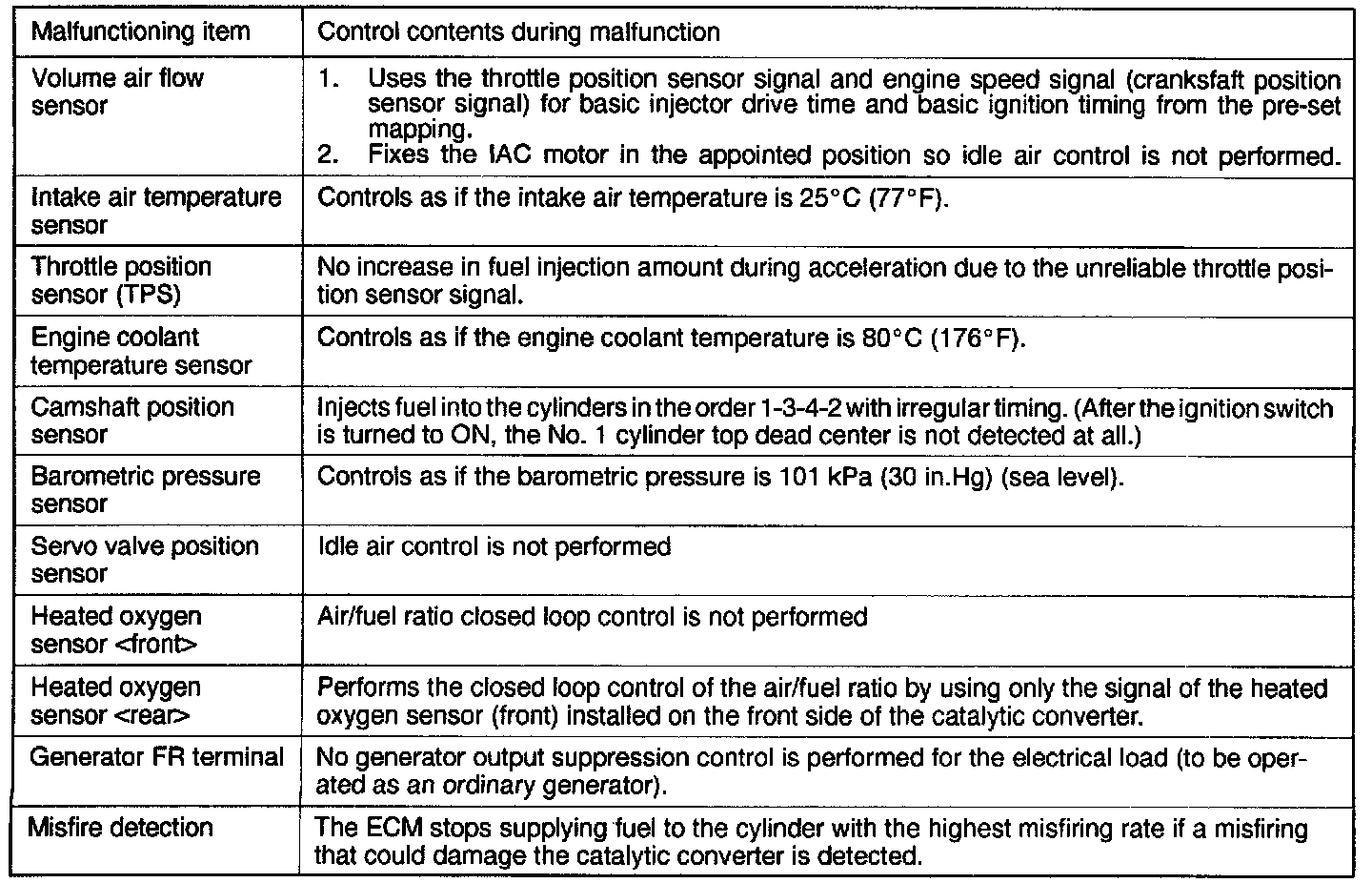 When the main sensor malfunctions are detected by the diagnostic test mode, the vehicle is controlled by means of the following defaults.