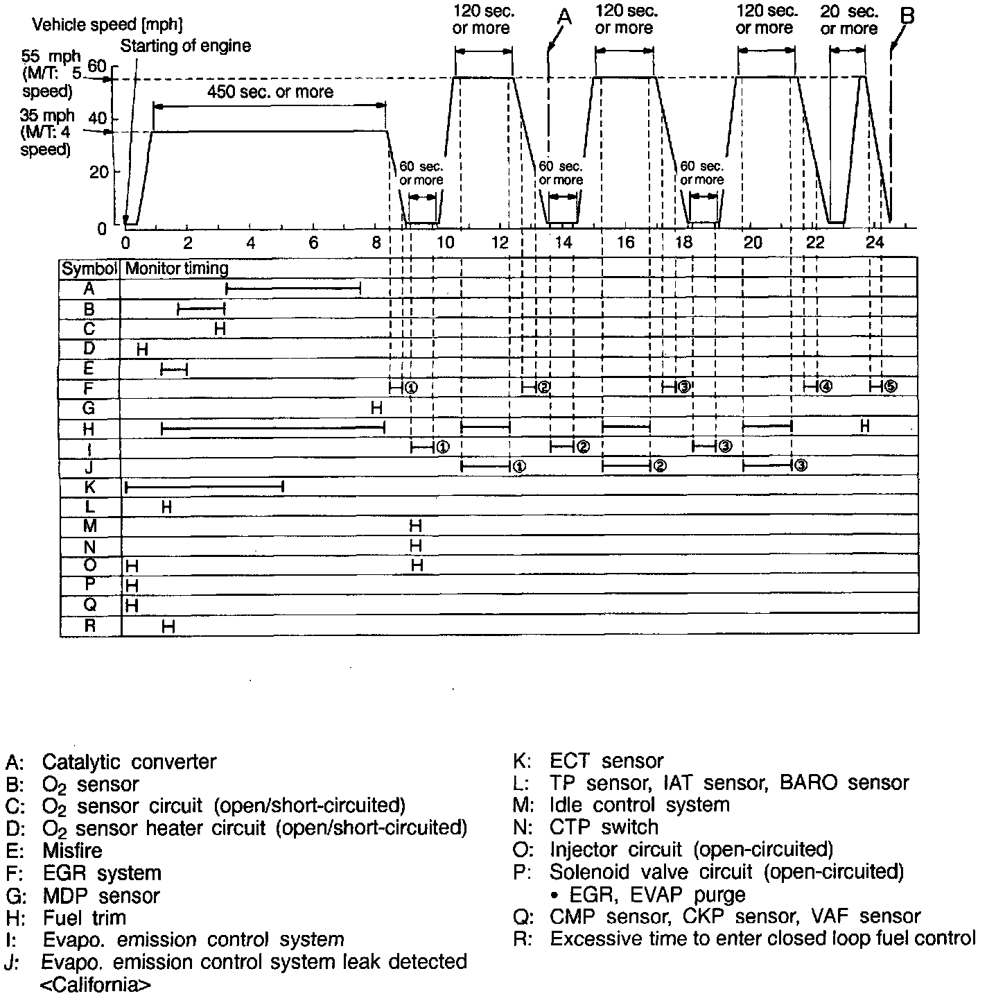 1. For checking the following four systems for illumination of the check engine/malfunction indicator lamp, perform the driving up to the point B twice successively. Before beginning with the first driving, turn off the ignition switch for more than 10 seconds.