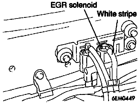 1. Disconnect the vacuum hose (white stripe) from the EGR solenoid, and then connect a hand vacuum pump via the three-way terminal.