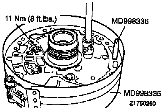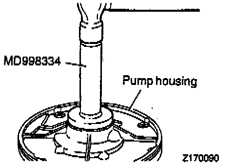 2. Insert the special tool, (Guide Pin MD998336 or equivalent), in the oil pump bolt hole and tighten the peripheries of the support and housing with the special tool, (Band MD998335 or equivalent), to locate the support and housing.