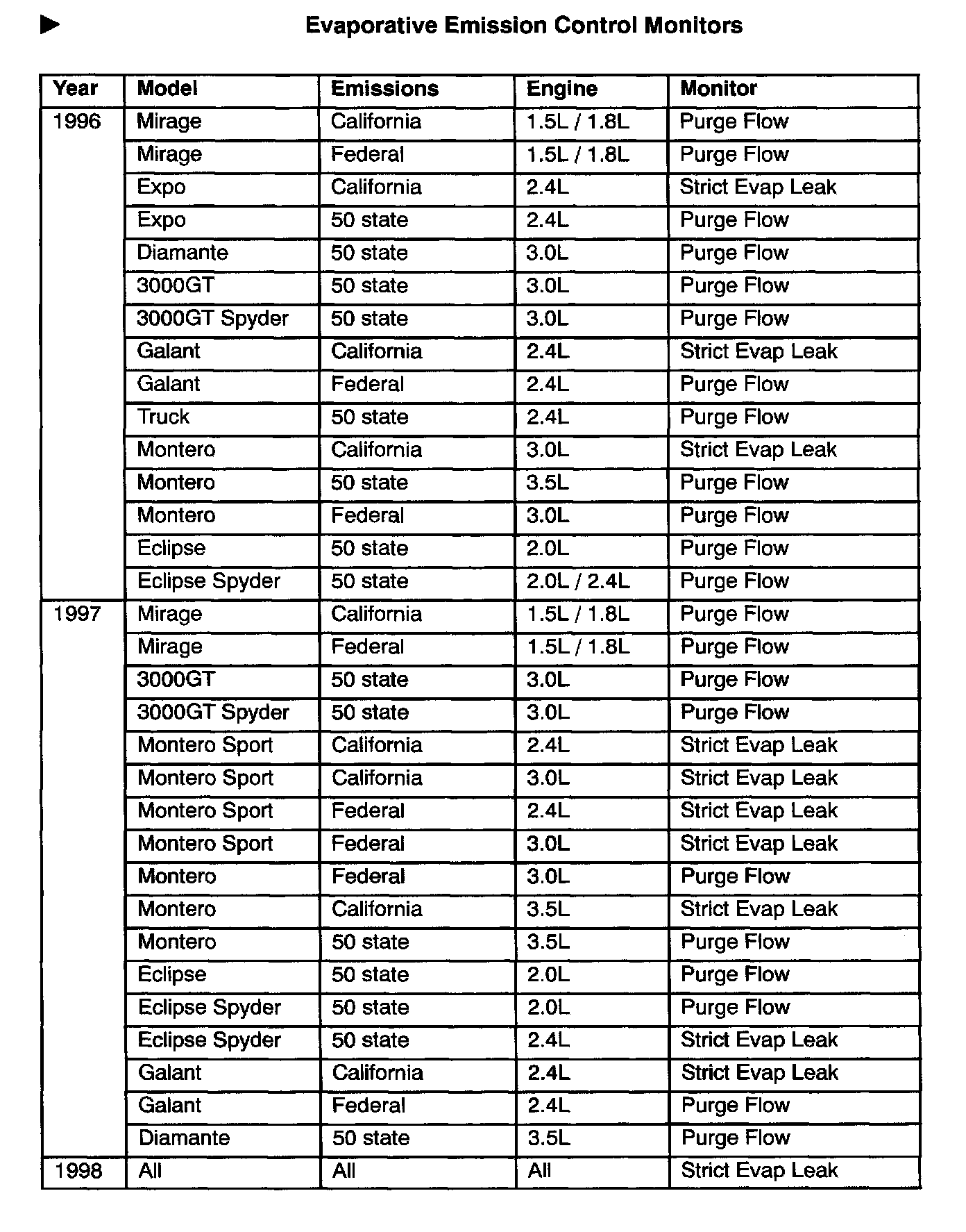 --> 1996-1998 Montero, Montero Sport, Diamante, Truck, 3000GT, Mirage, Galant, Expo/Expo LRV, and Eclipse models (except 2.0L non-turbo 420A engine models)