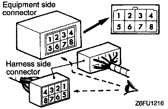 - When checking the terminal voltage, etc., with the connectors disconnected, do not insert the test probe if the check terminal has female pins.