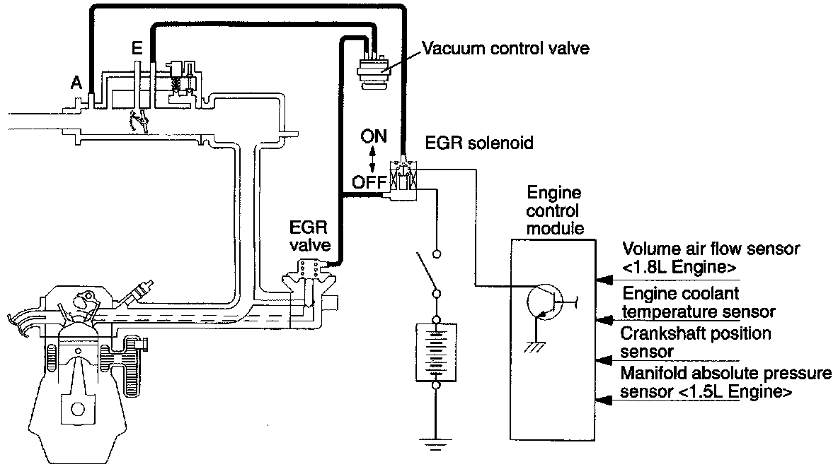 The exhaust gas recirculation (EGR) system lowers the nitrogen oxide (NOx) emission level. When the air/fuel mixture combustion temperature is high, a large quantity of nitrogen oxides (NOx) is generated in the combustion chamber.This system recirculates part of emission gas from the exhaust port of the cylinder head to the combustion chamber through the intake manifold to decrease the air/fuel mixture combustion temperature, resulting in reduction of NOx.