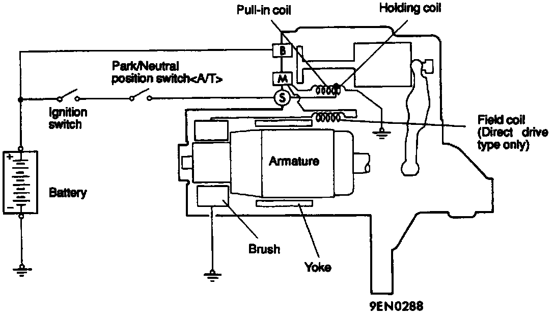 The starting system includes the battery, starter motor, magnet switch, ignition switch, Park/Neutral Position (PNP) switch (on models equipped with an automatic transmission), starter or PNP switch relays, connecting wires and battery cables.