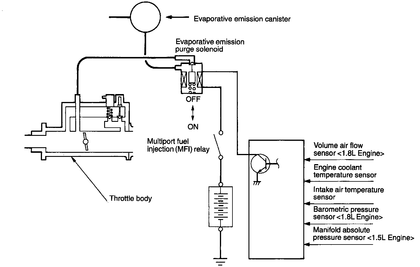 When the engine coolant temperature is low or when the intake air quantity is small (when the engine is at idle, for example), the engine control module brings the EVAP purge solenoid into the OFF state to shut off the fuel vapor flow to the intake manifold plenum. This not only insures the driveability when the engine is cold or running under low load but also stabilizes the emission level.