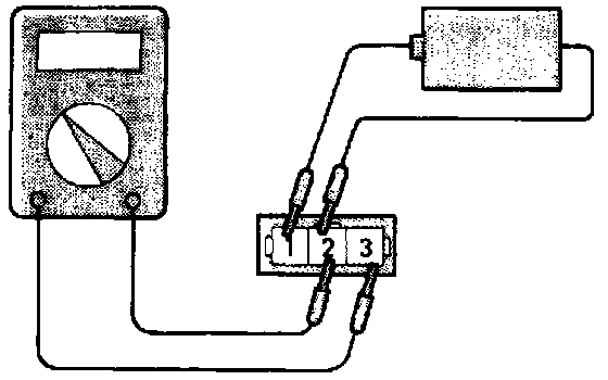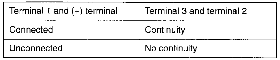 1. Connect the negative (-) terminal of the 1.5V power supply to terminal (2) of the ignition power transistor; then check whether there is continuity between terminal(3) and terminal(2) when terminal (1) and the positive (+) are connected and disconnected.