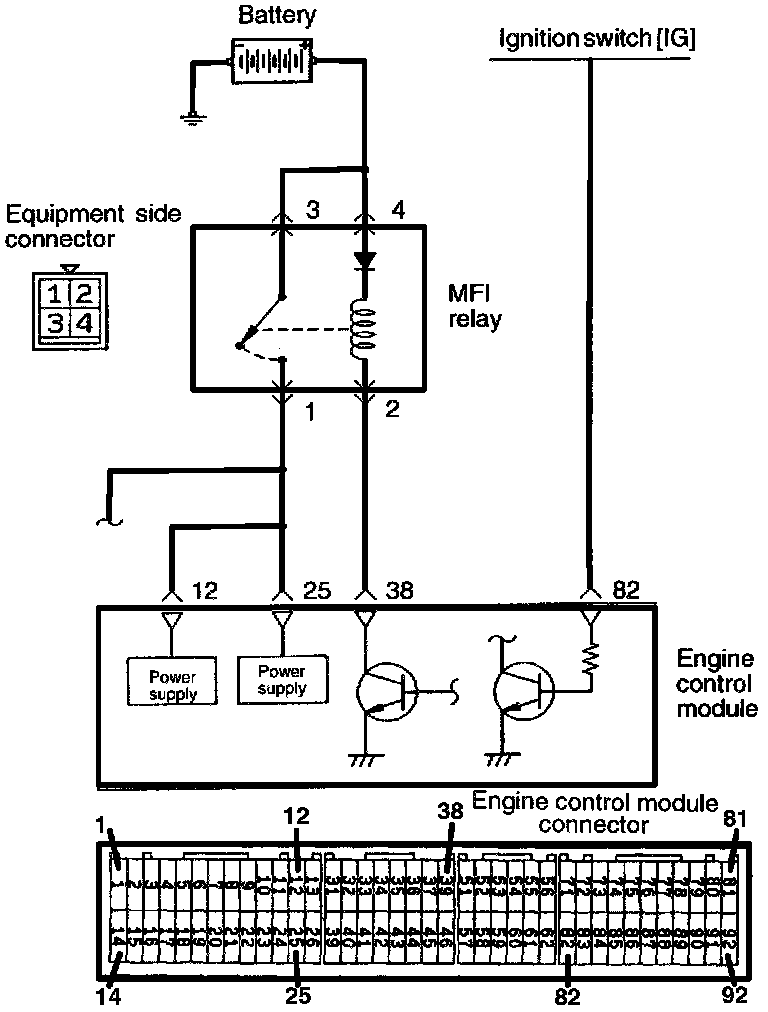 - When the ignition switch is turned on, the battery voltage is applied from the ignition switch to the engine control module, which then turns ON the power transistor to energize the MFI relay coil. This turns ON the MFI relay switch and the power is supplied from the battery to the engine control module through the MFI relay switch.