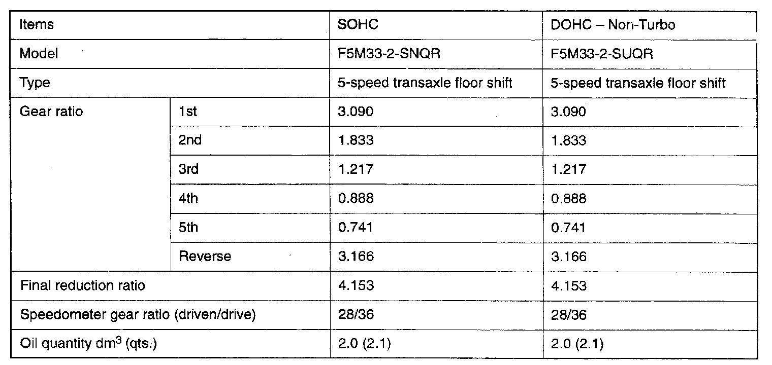 F5M31/F5M33 5-spd M/T, Gear Ratios: